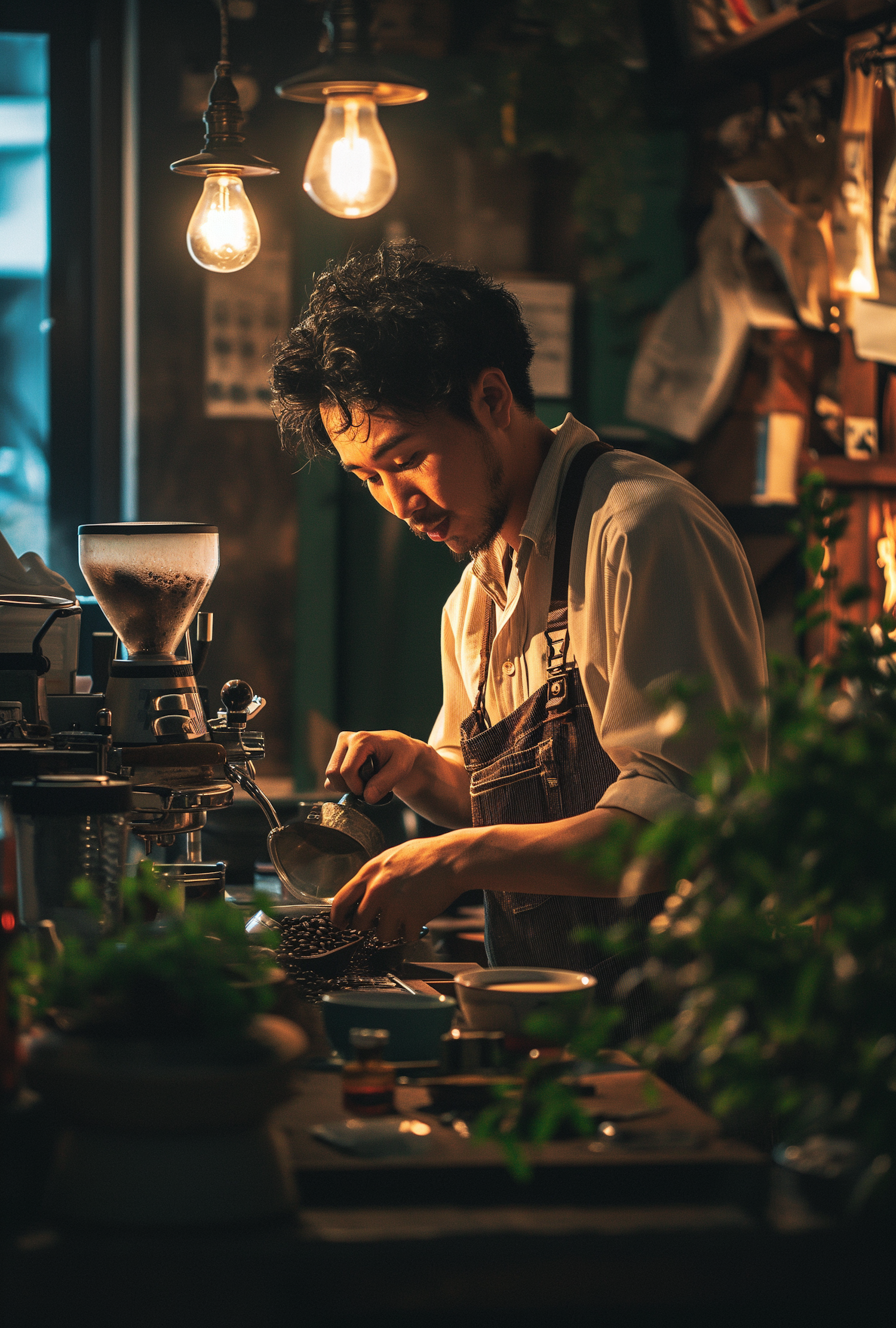 Barista in a cozy café prepares coffee under warm lighting, surrounded by plants and rustic decor.