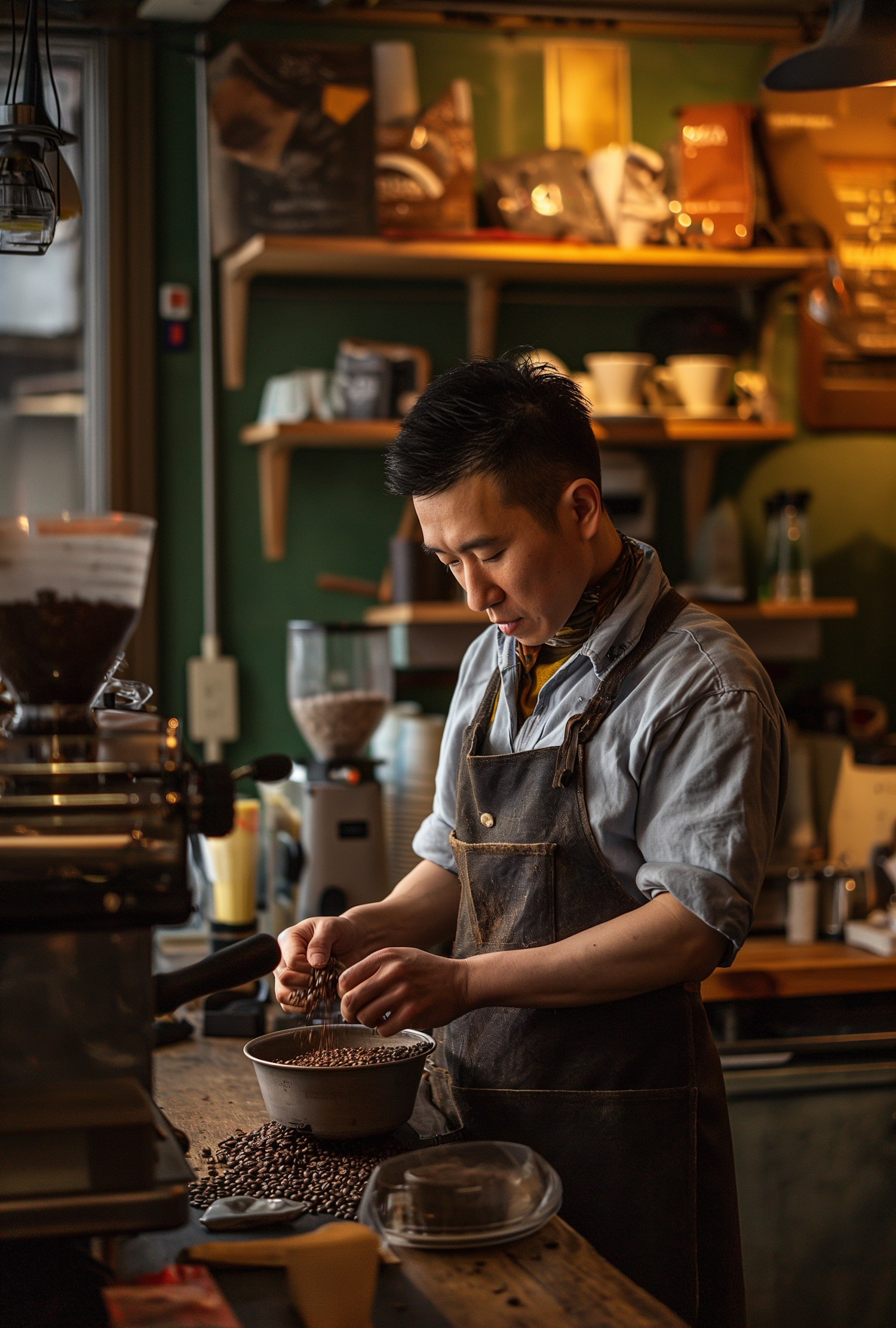 Asian barista sorting coffee beans in a cozy shop, wearing an apron. Warm lighting and coffee equipment create an inviting atmosphere.