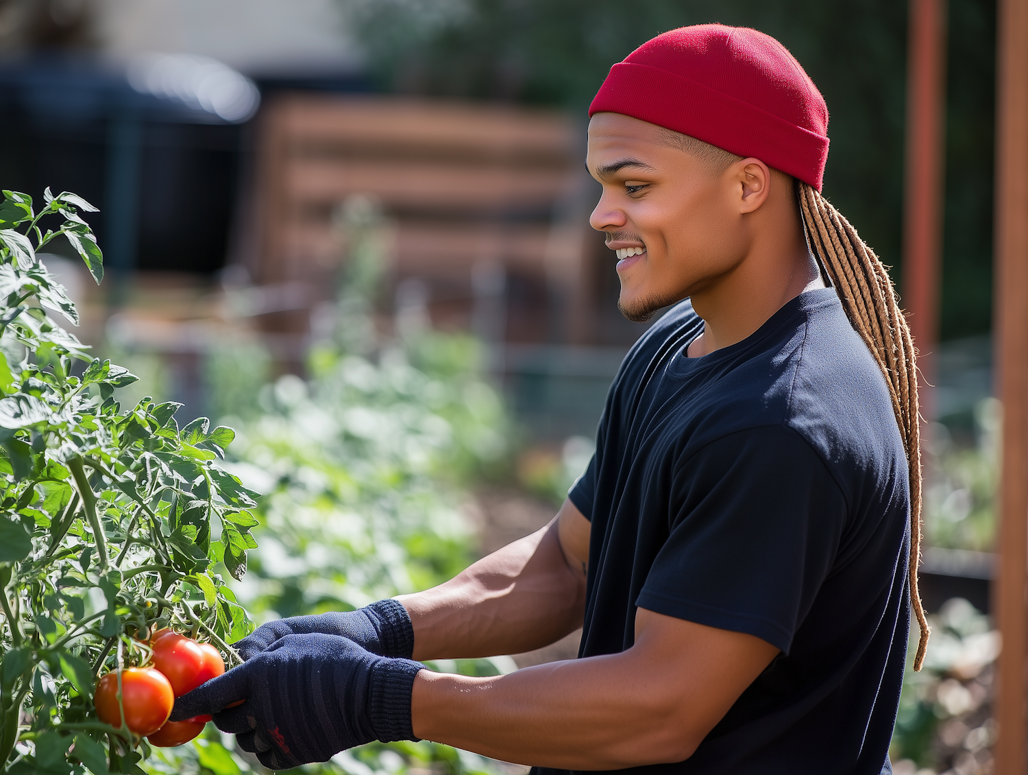 Young man with dreadlocks and red beanie harvesting tomatoes in a garden, wearing black gloves and a black t-shirt.