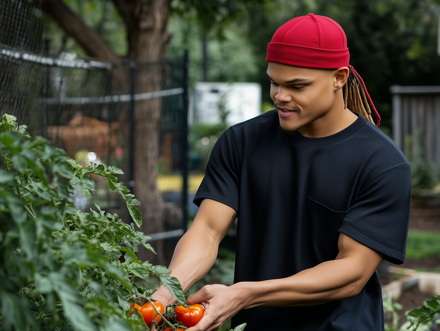 Young man with dreadlocks picking tomatoes in a garden, wearing a red headscarf and black t-shirt, surrounded by lush greenery.