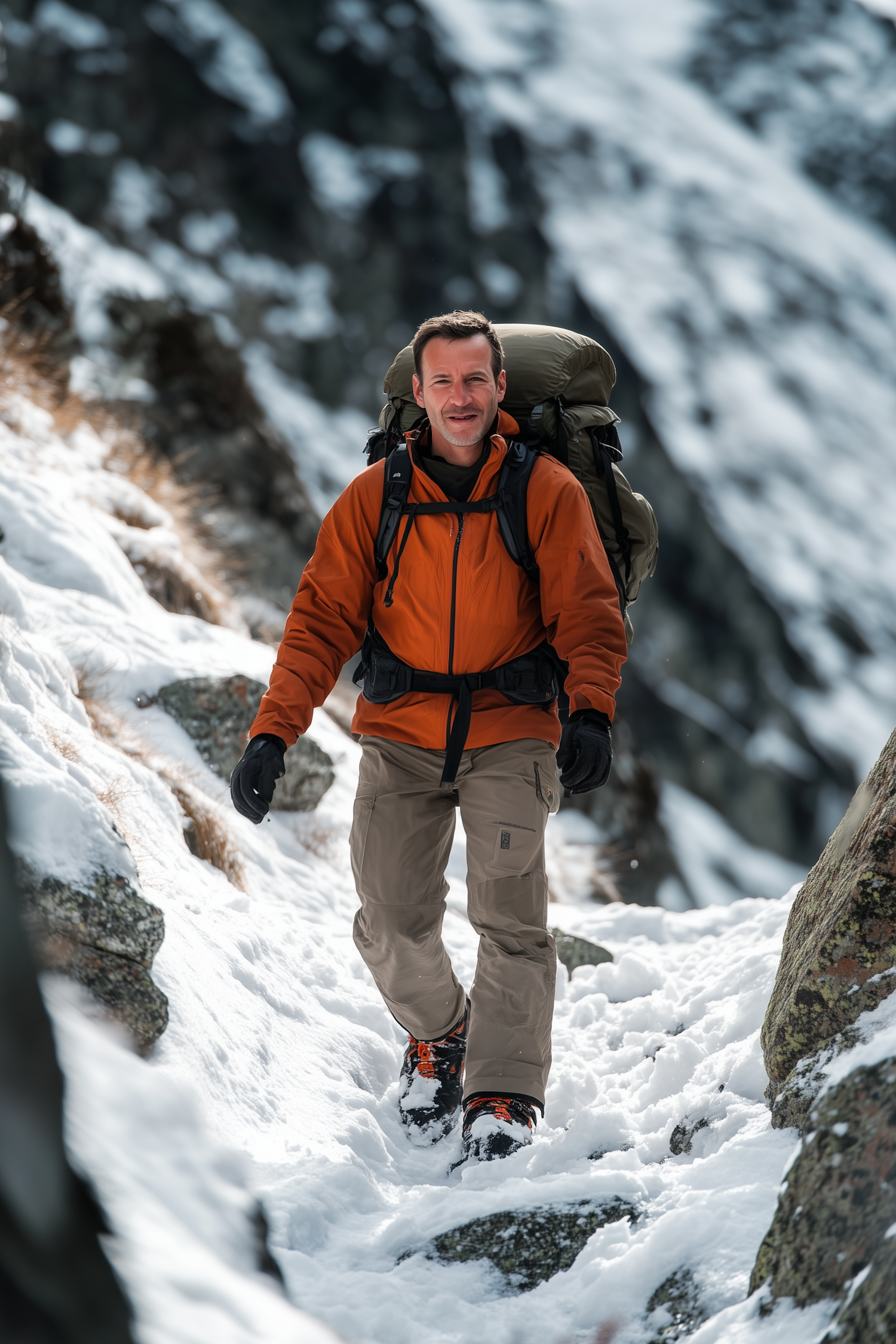 Man hiking in snowy mountains with orange jacket and backpack, navigating rocky trail. Adventure and winter exploration theme.
