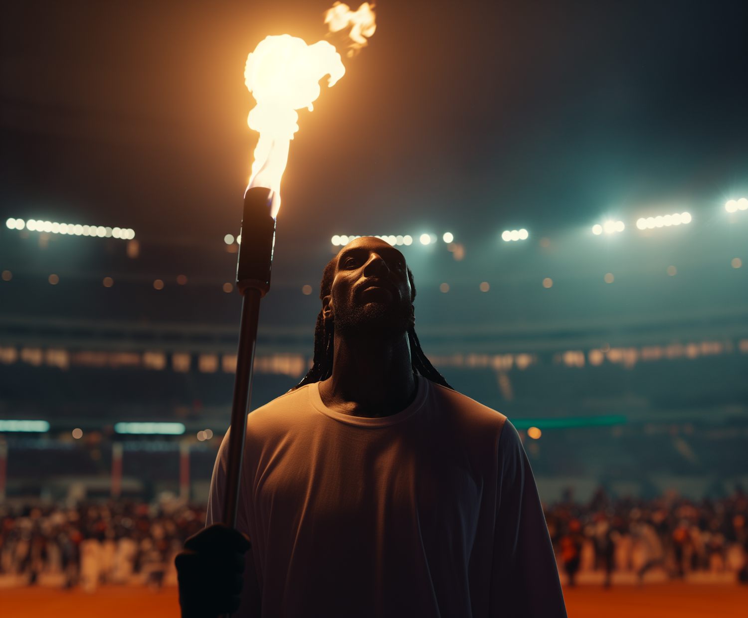 A man holding a flaming torch in a stadium, surrounded by bright lights and a blurred crowd, creating a dramatic atmosphere.