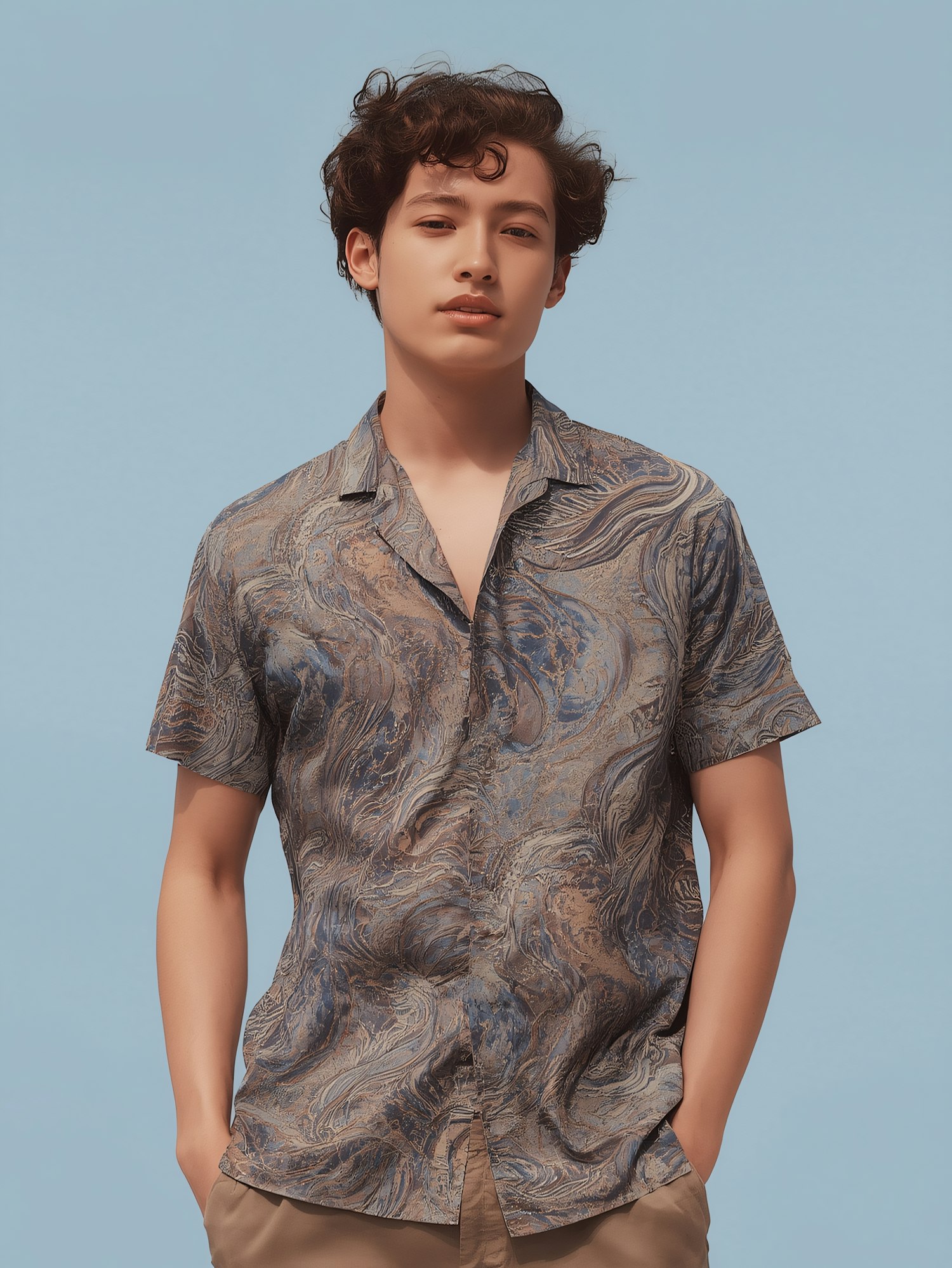 Young man in a patterned shirt and beige pants, standing against a light blue background with a casual pose and neutral expression.