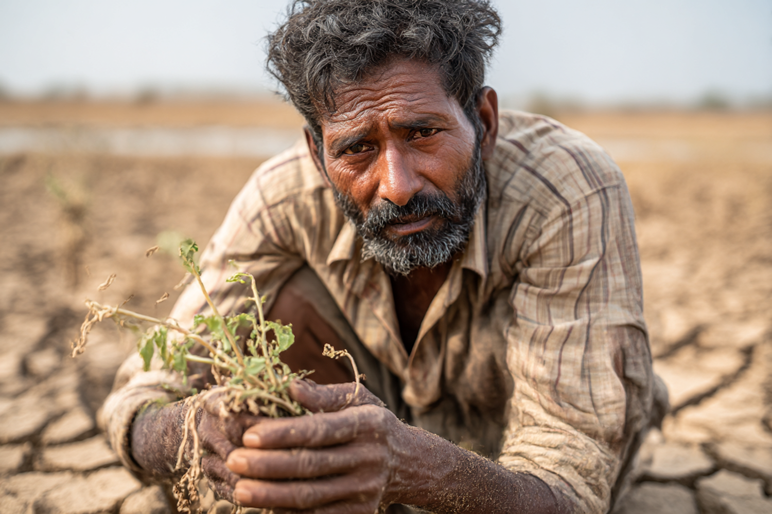 A man crouches in a dry field, holding a withered plant, symbolizing the challenges of drought and agriculture.