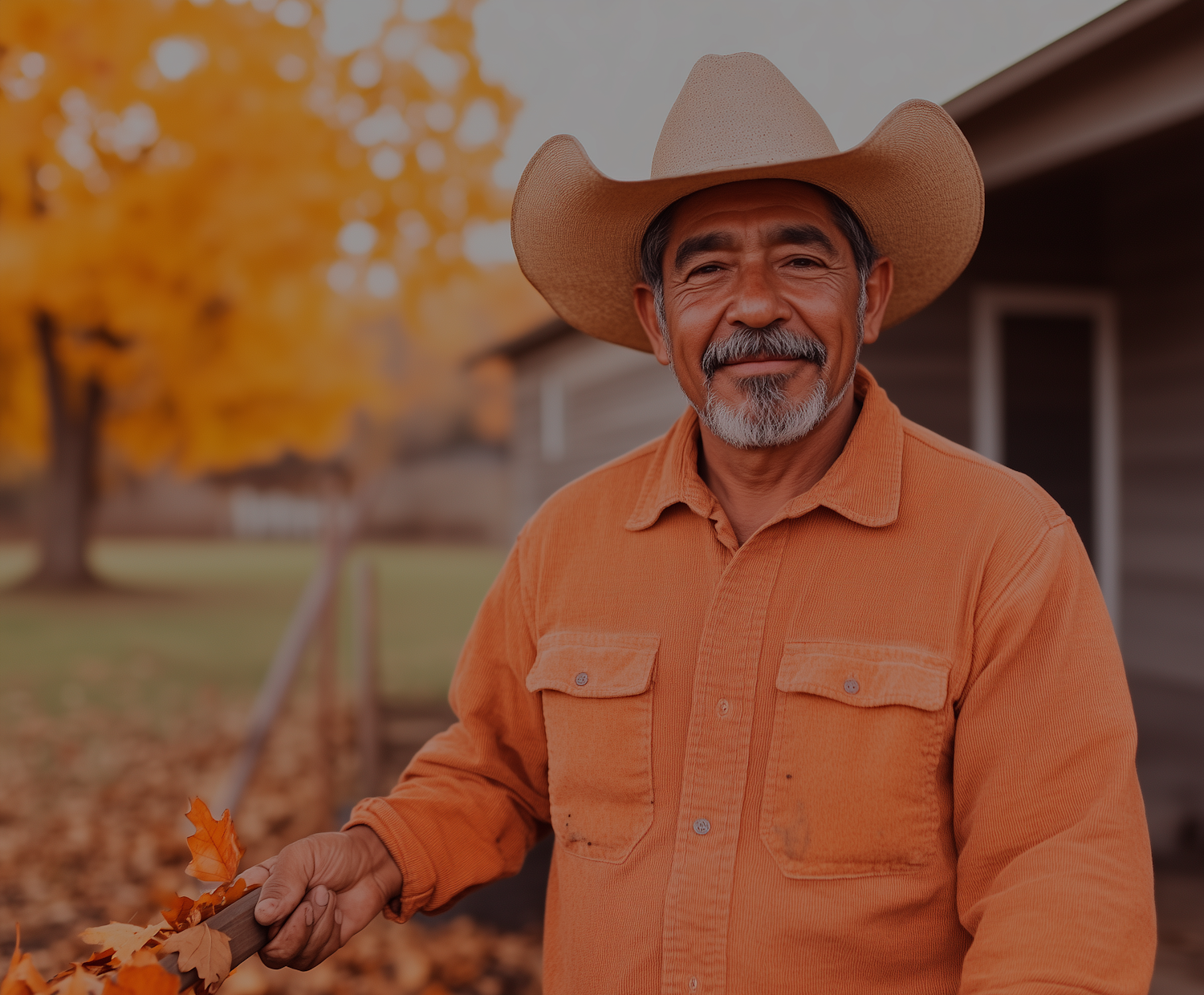 Hispanic man in cowboy hat raking autumn leaves, wearing orange shirt. Warm fall setting with golden tree and house in background.