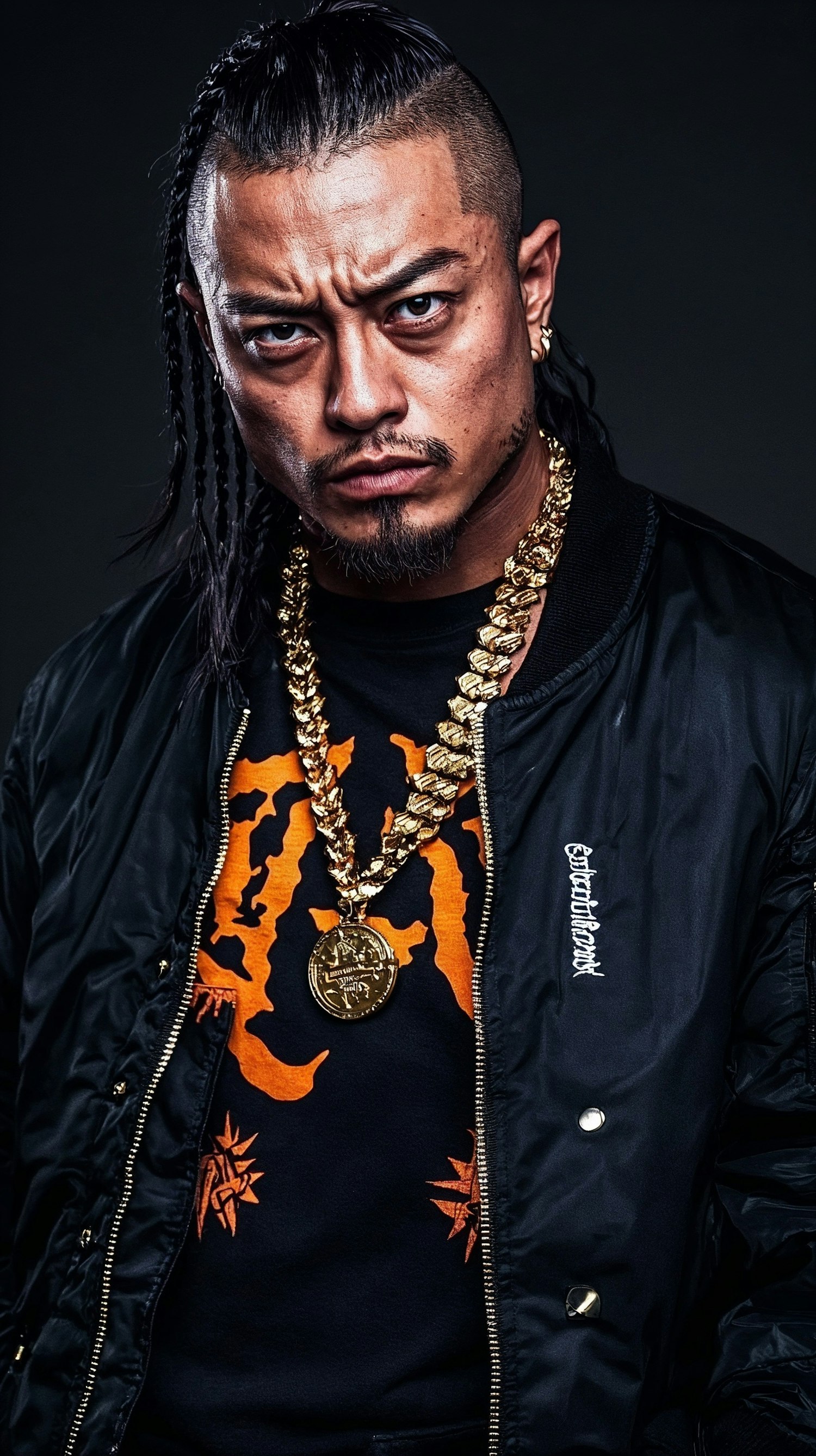 Man with braided hair, gold chain, and intense expression in a black bomber jacket and orange graphic shirt against a dark background.