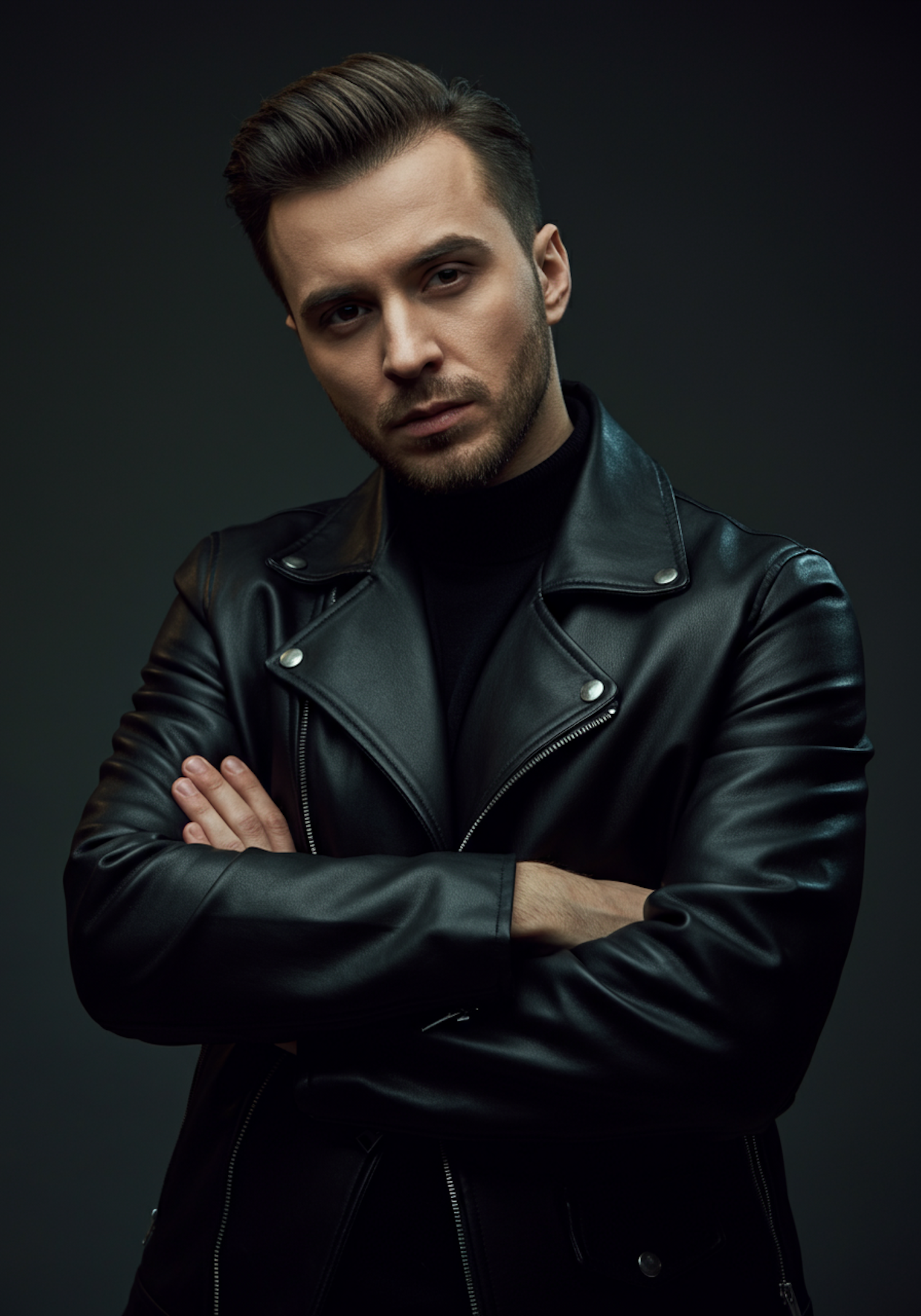 Stylish man in black leather jacket with arms crossed, exuding confidence and a serious expression against a dark background.