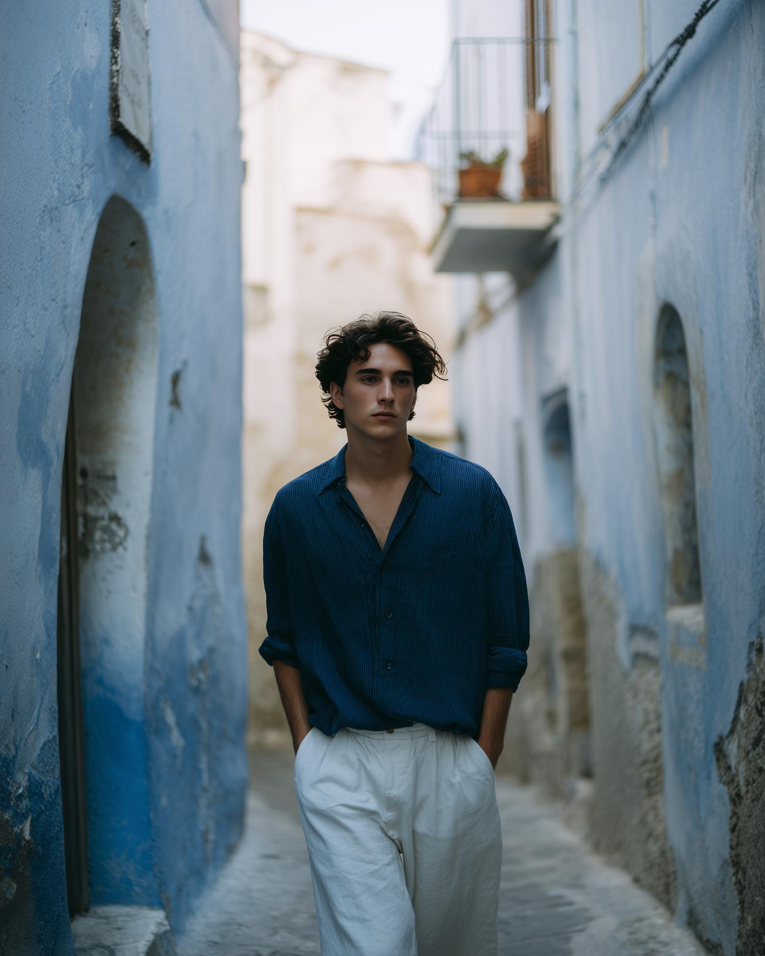 Stylish young man in a blue shirt and white trousers walking through a charming blue-walled alleyway.