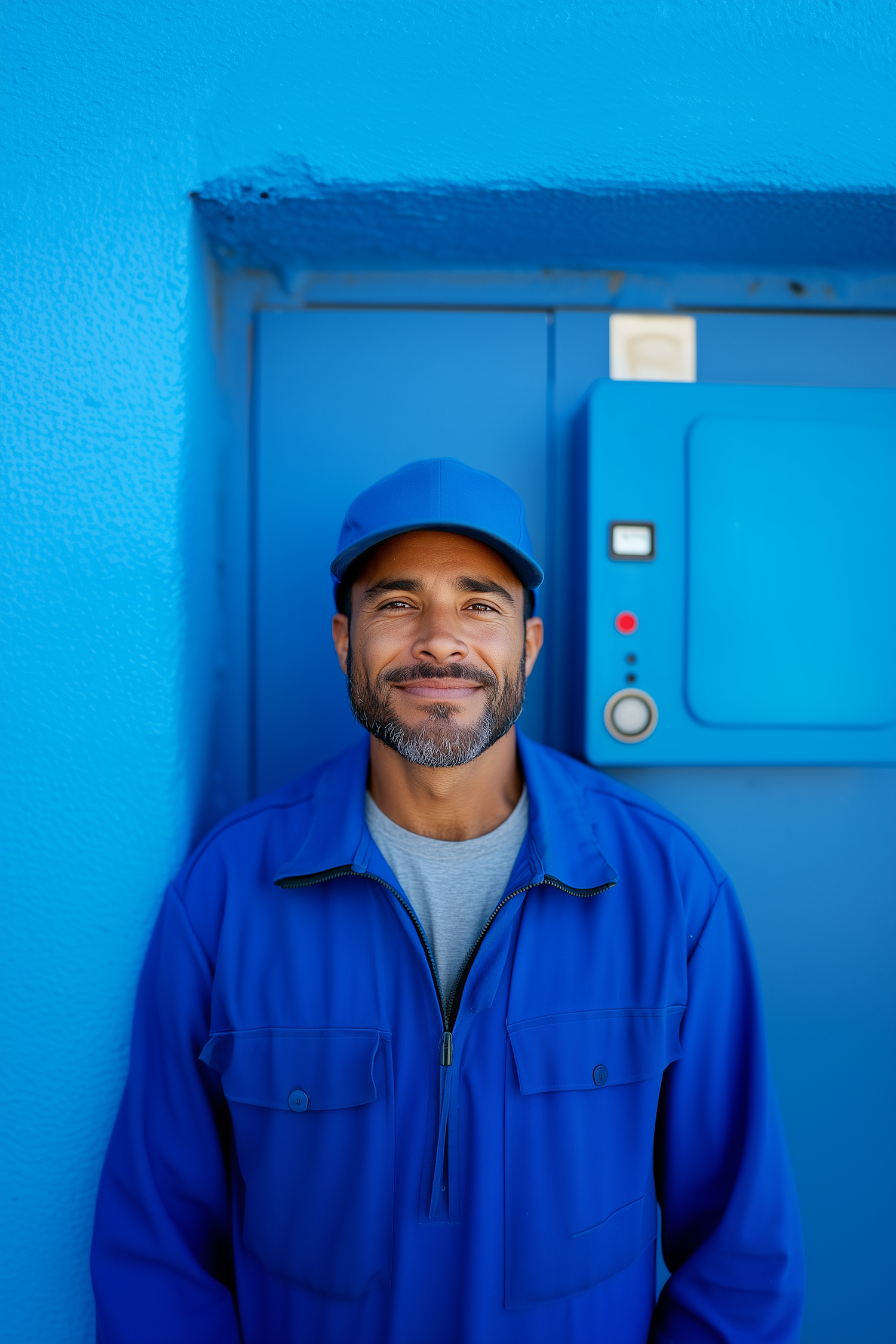 Man in blue uniform and cap smiling against a vibrant blue wall with matching panel.