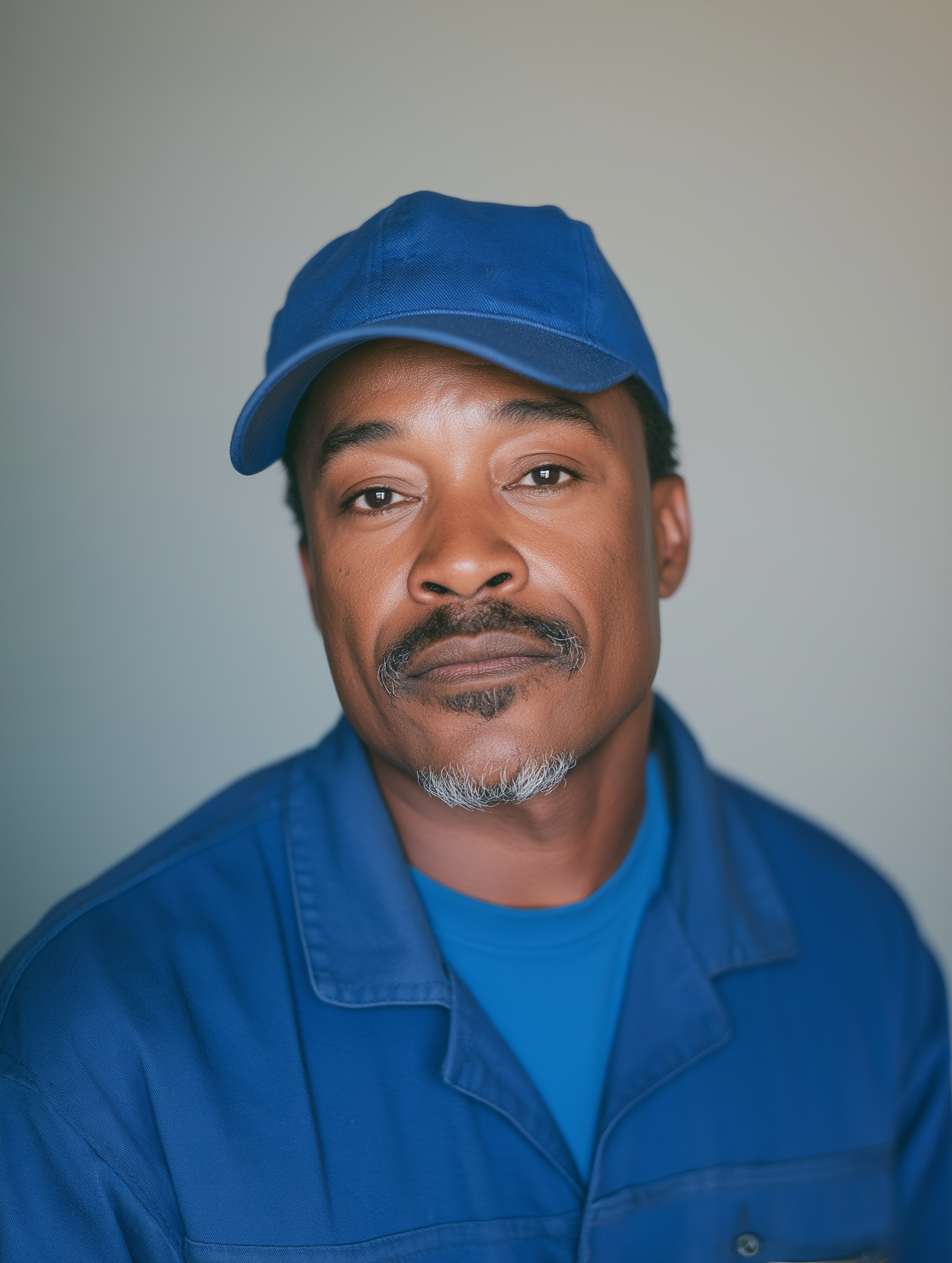 Middle-aged Black man in blue work uniform and cap, with a calm expression and neatly trimmed goatee.