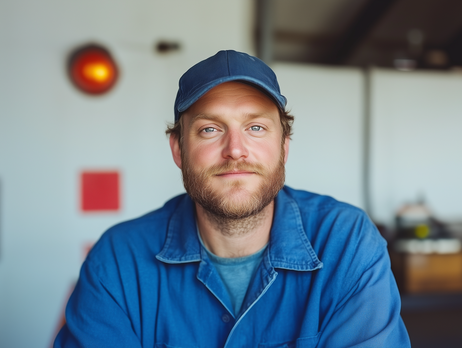 Caucasian man in blue work attire with a cap, sitting in a workshop setting, looking relaxed and calm.
