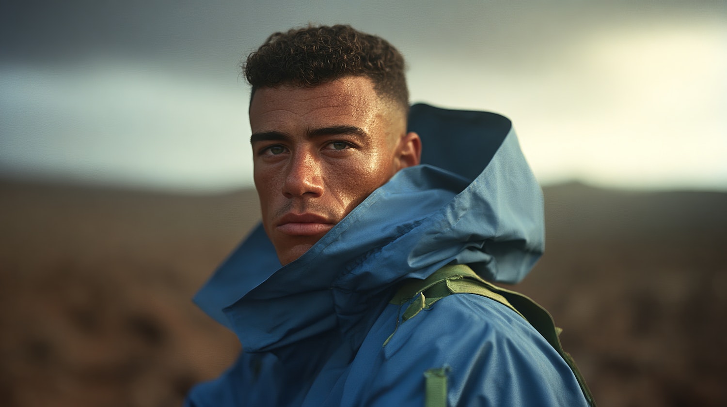A man in a blue jacket stands outdoors against a blurred earthy background, with dramatic lighting highlighting his features.