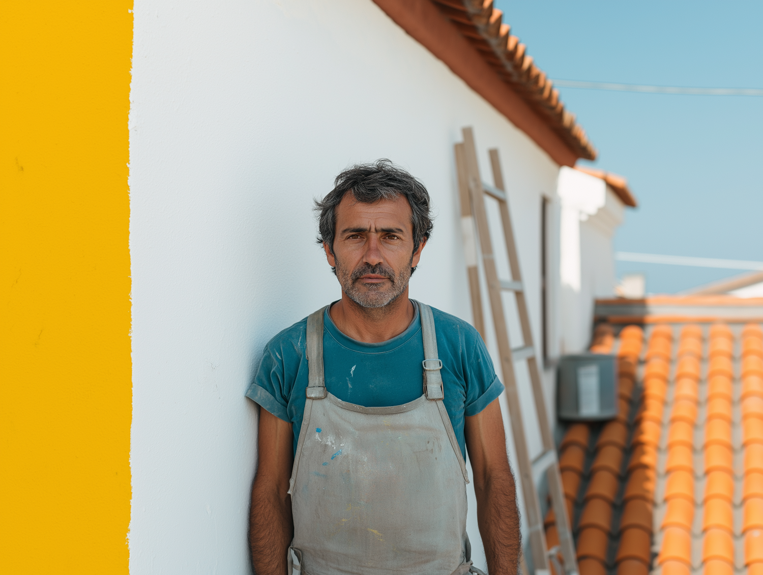 Middle-aged man in paint-splattered apron stands against a vibrant yellow and white wall, with orange roof tiles and a clear blue sky.