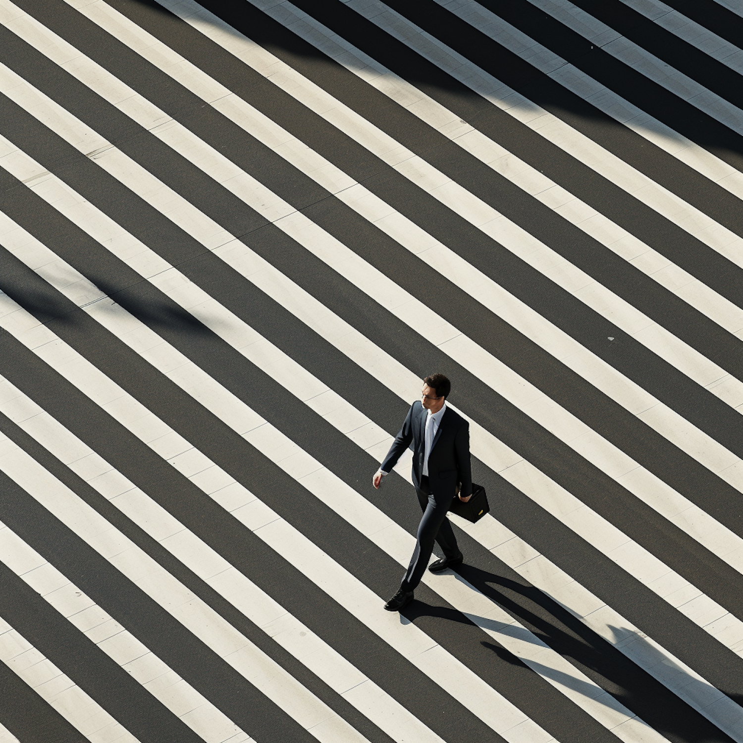 Man in a suit walking across a zebra crossing, carrying a briefcase. Elevated view with striking black and white pattern.