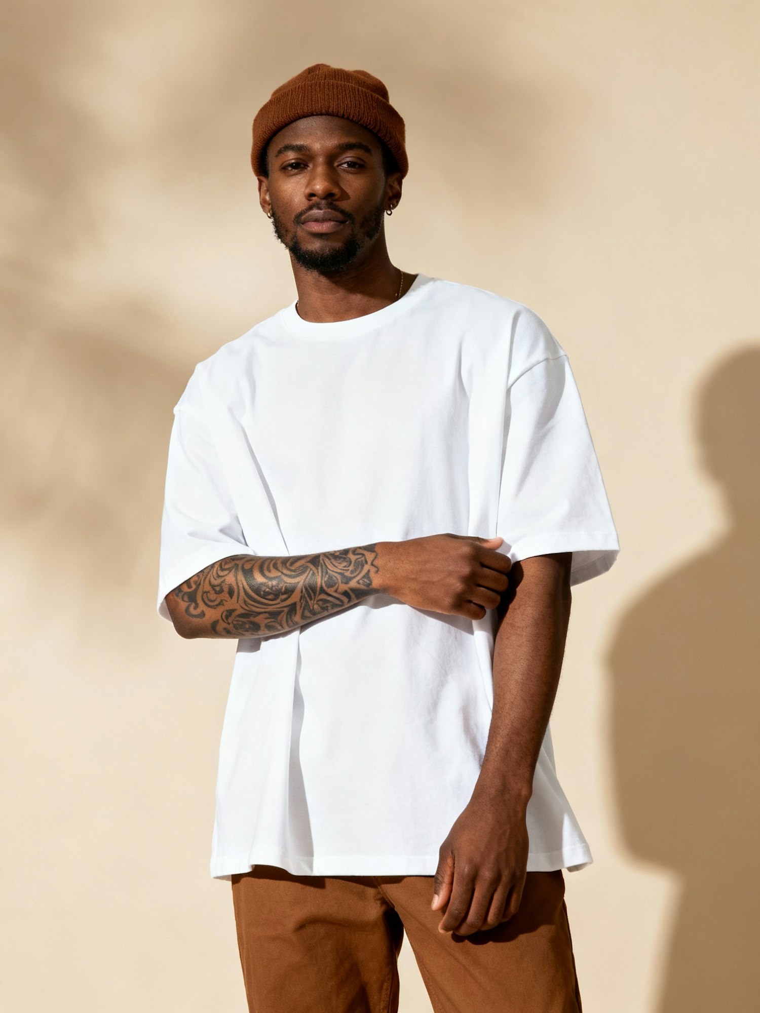 Waist-up, ultra-high-definition portrait of a stylish Black man standing confidently against a soft beige background. He wears a white oversized T-shirt and relaxed brown pants, paired with a brown beanie. One arm is slightly raised, revealing a detailed tattoo sleeve that adds texture and narrative to the composition. His posture is casual yet composed, with soft directional lighting casting subtle shadows that emphasize the folds of his shirt and the ink on his skin. The beige backdrop enhances the warmth of his outfit and skin tone, creating a grounded, minimalist mood. The overall vibe is modern, editorial, and culturally resonant—ideal for a fashion-forward identity portrait or Afro-fusion streetwear showcase.