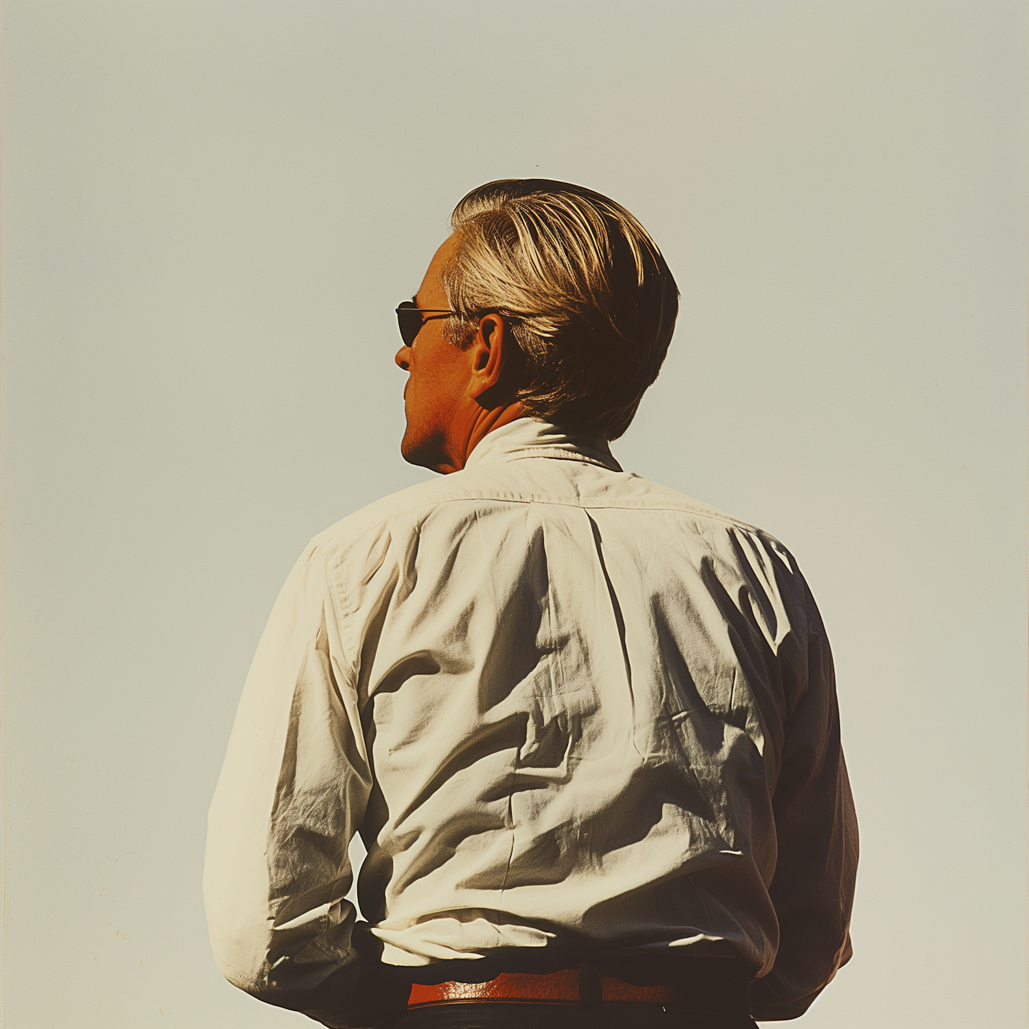 A man with silver hair and sunglasses stands against a clear sky, wearing a white shirt. The scene exudes calm and contemplation.