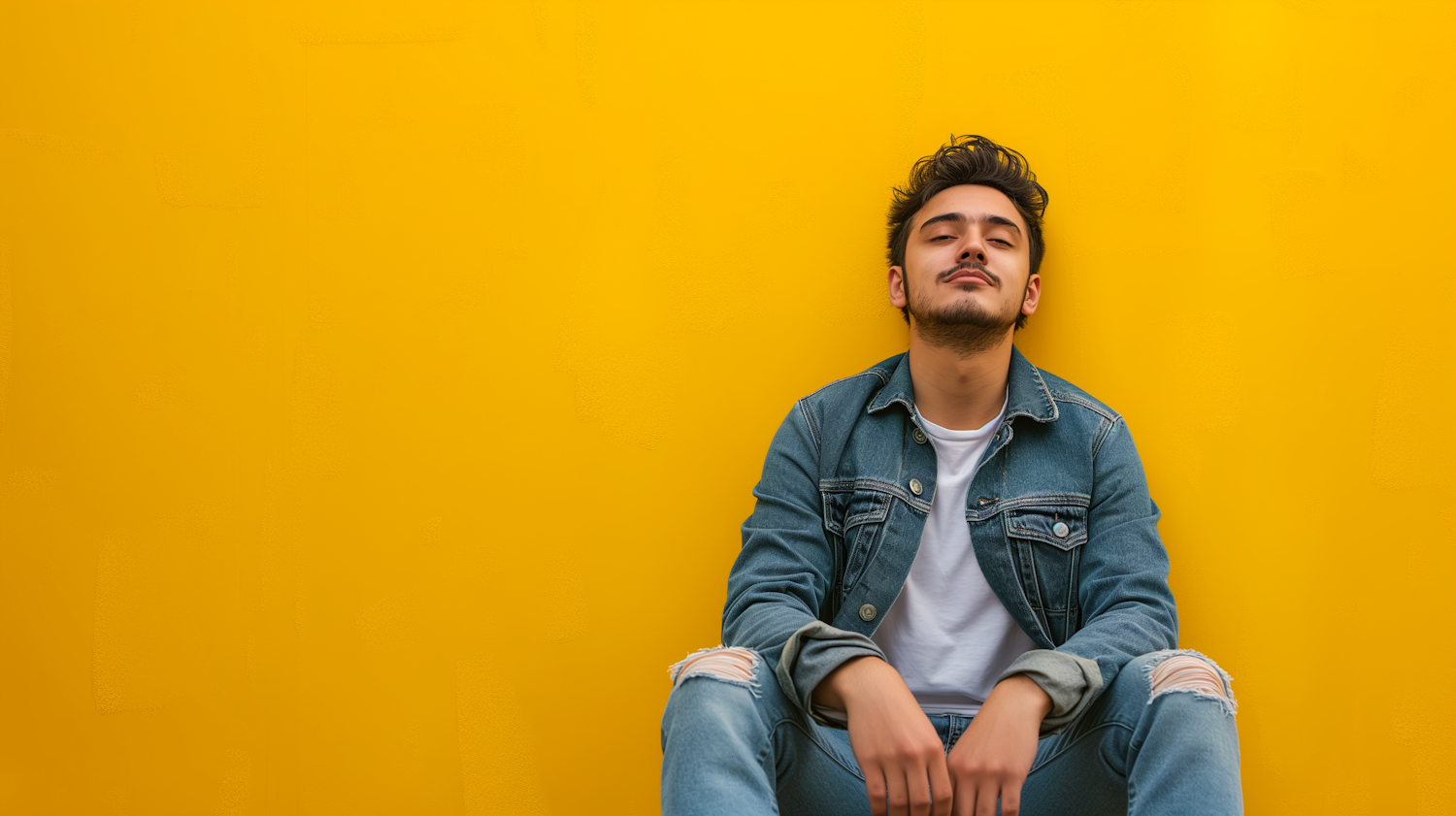 Young man in denim jacket and ripped jeans sits against a bright yellow background, exuding a relaxed and stylish vibe.