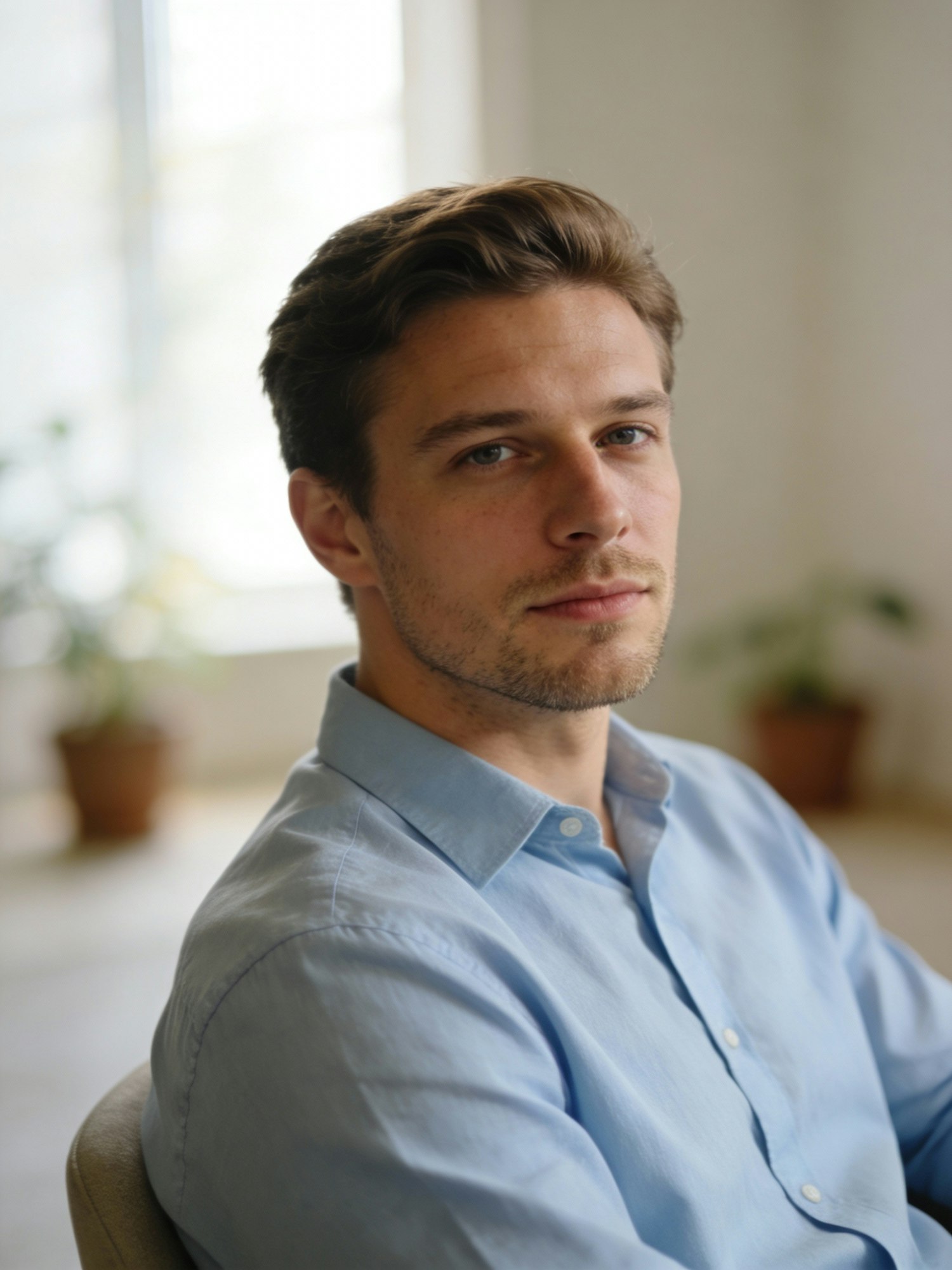 A man in a light blue shirt with a neutral expression sits indoors with a softly blurred background of a window and plants.