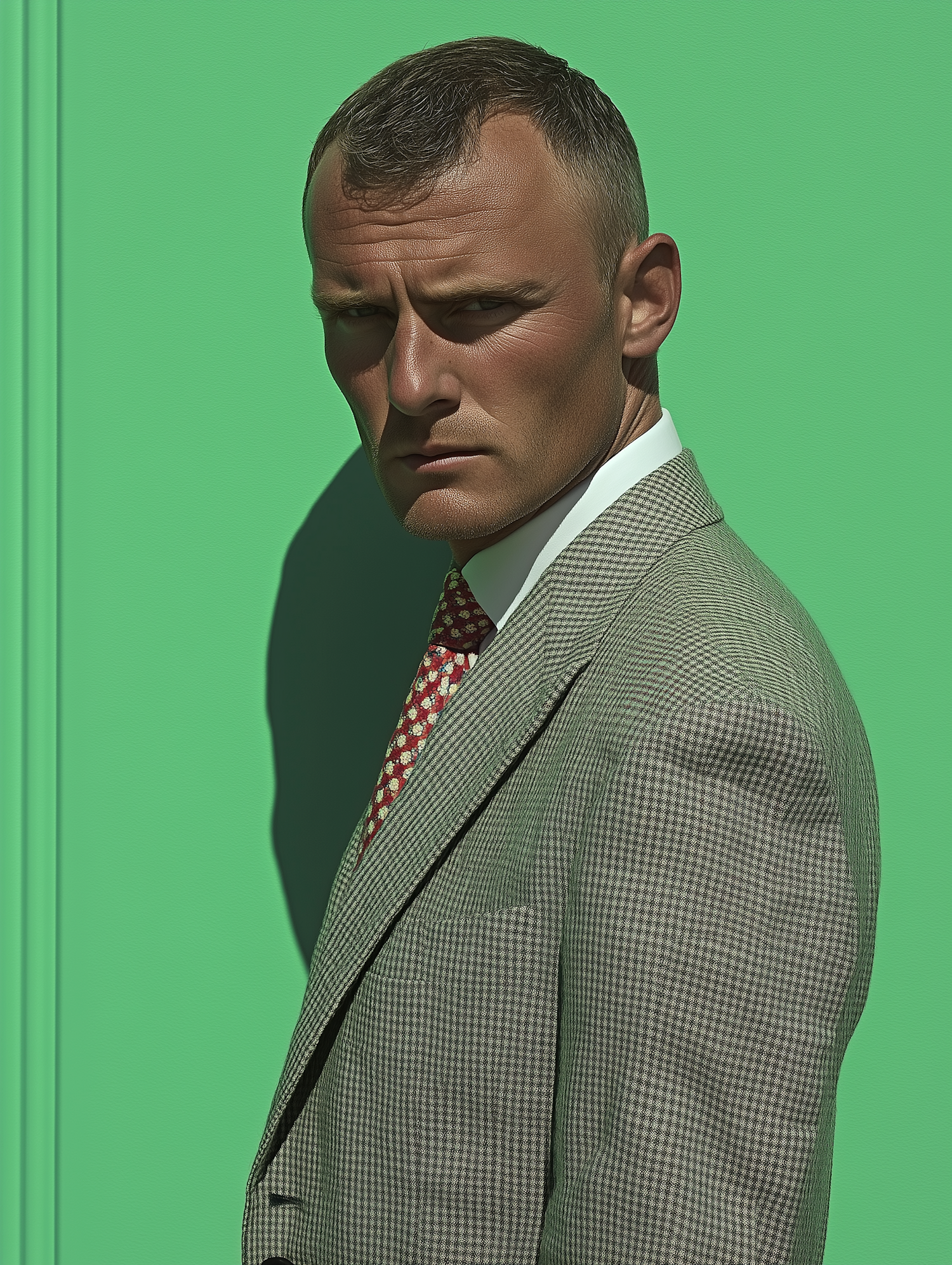 Man in houndstooth suit with red tie against a vibrant green background, face blurred for privacy.