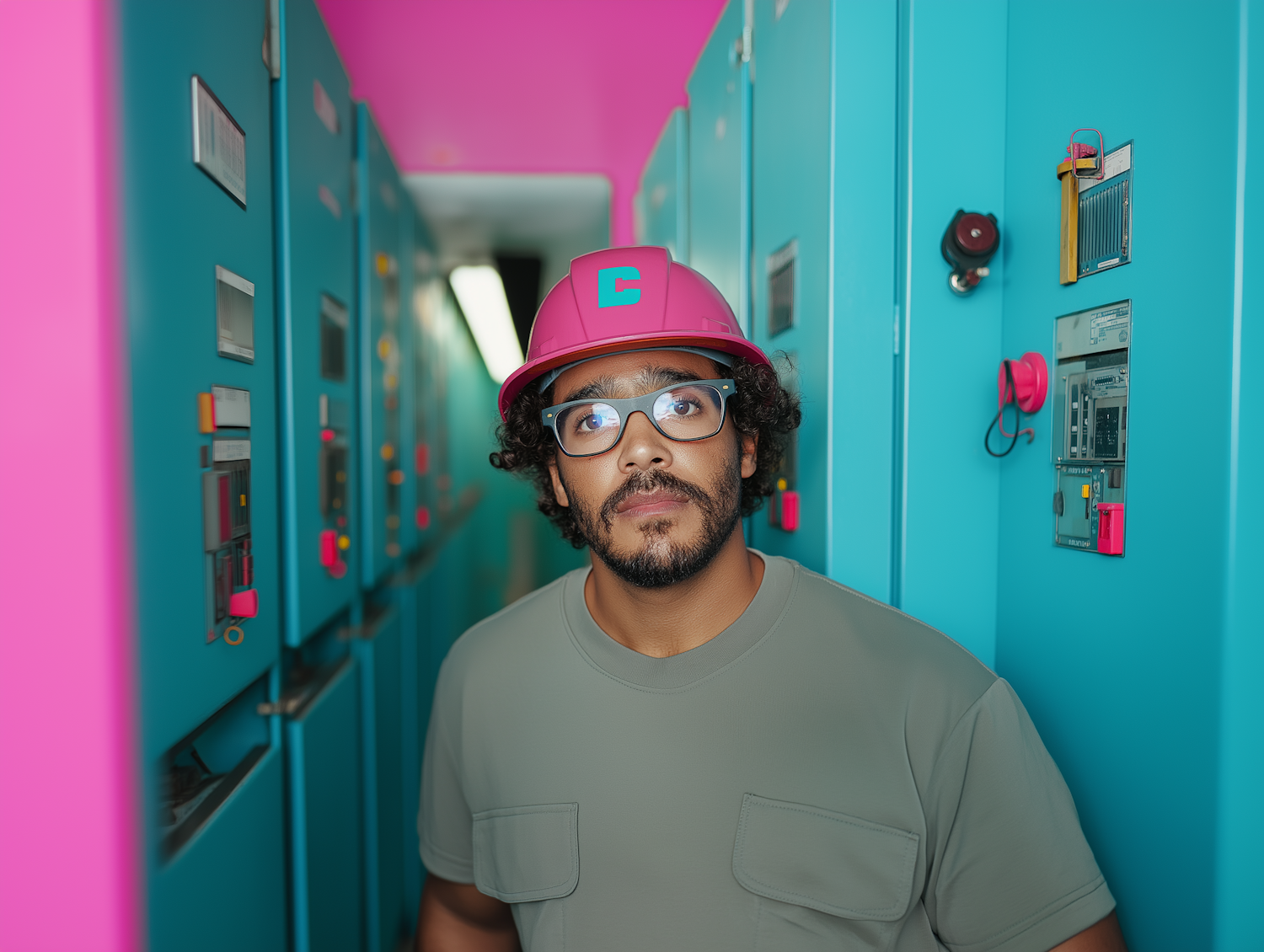 Man in pink hard hat and glasses in a colorful corridor with turquoise and pink electrical panels.
