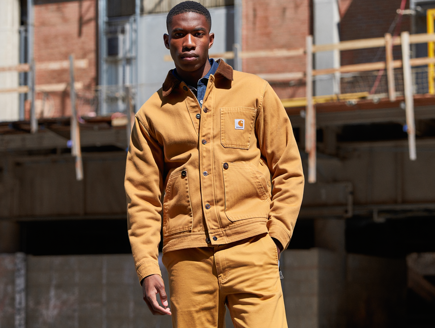 Man in tan workwear standing confidently in an urban construction setting, showcasing durable and stylish outdoor apparel.