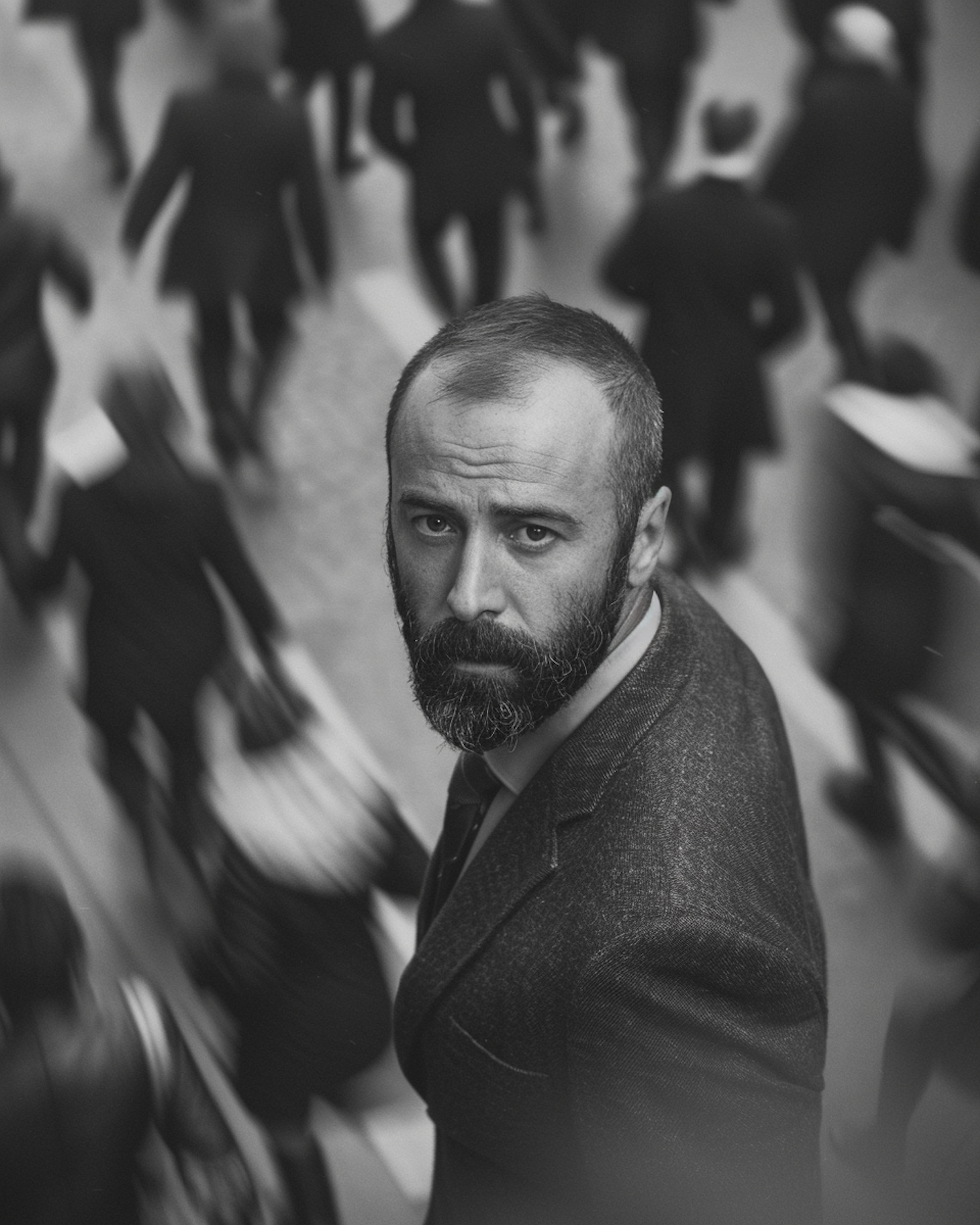 A contemplative man in a suit stands still amidst a blurred, bustling crowd in this striking black and white photo.