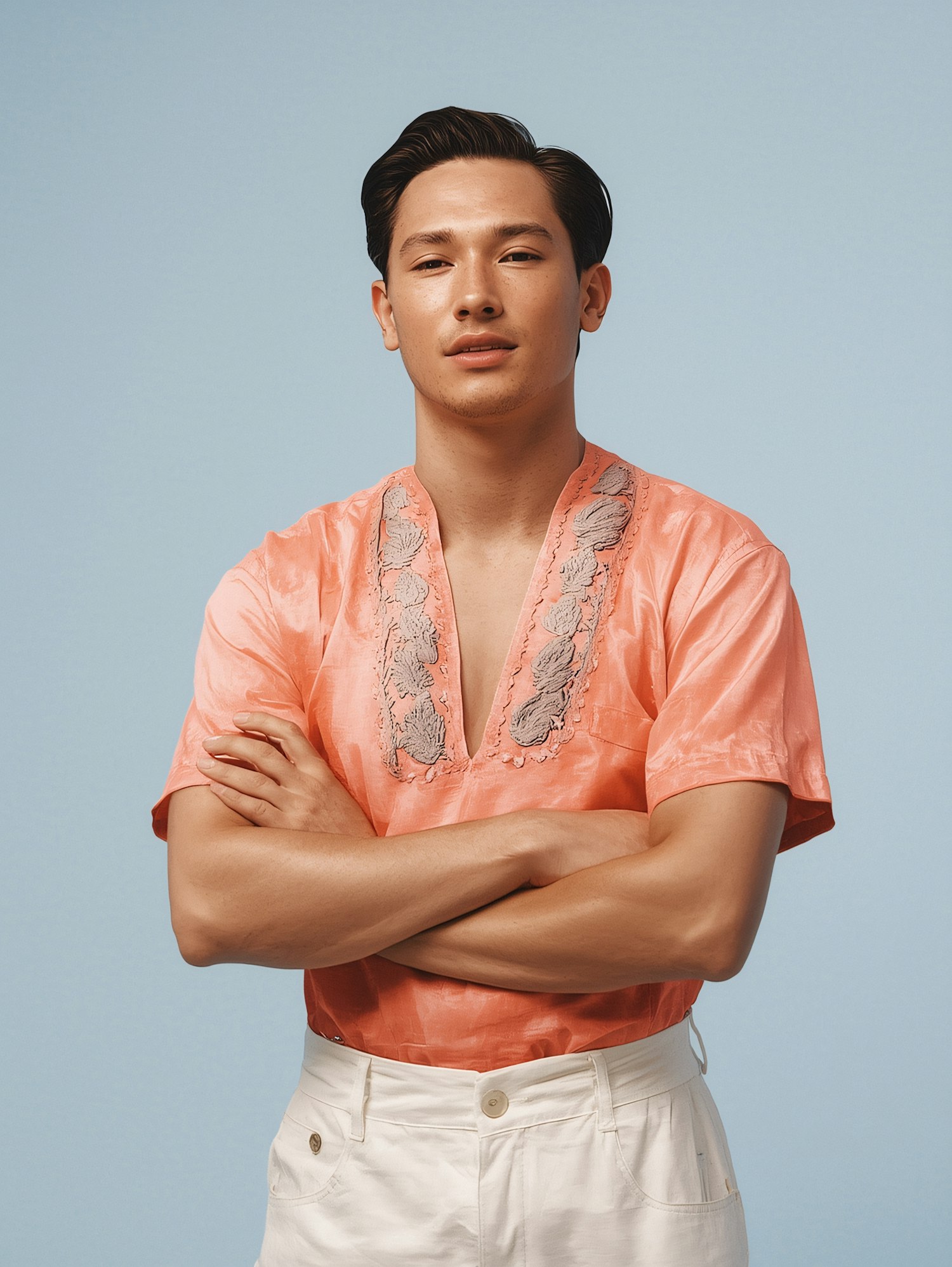 Man in coral embroidered shirt and white trousers, standing confidently against a light blue background.
