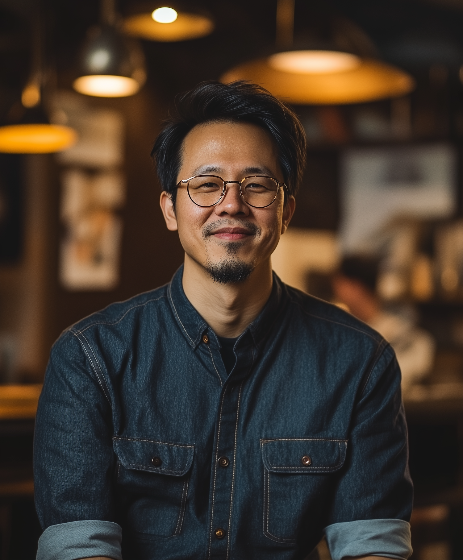 Asian man with glasses and goatee in a denim shirt, seated in a warmly lit room with hanging lamps and a blurred background.