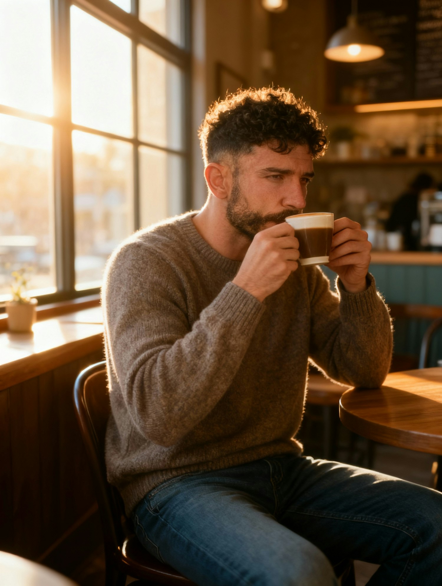 A man enjoys a coffee in a cozy café, bathed in warm sunlight from a large window, creating a serene and inviting atmosphere.
