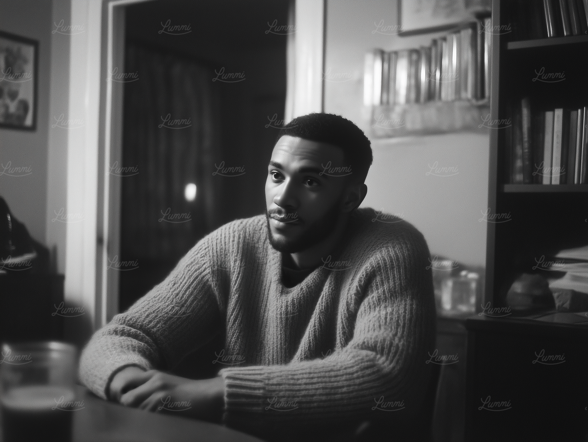 Black-and-white photo of a man in a cozy sweater sitting at a table, with a bookshelf and soft lighting in the background.