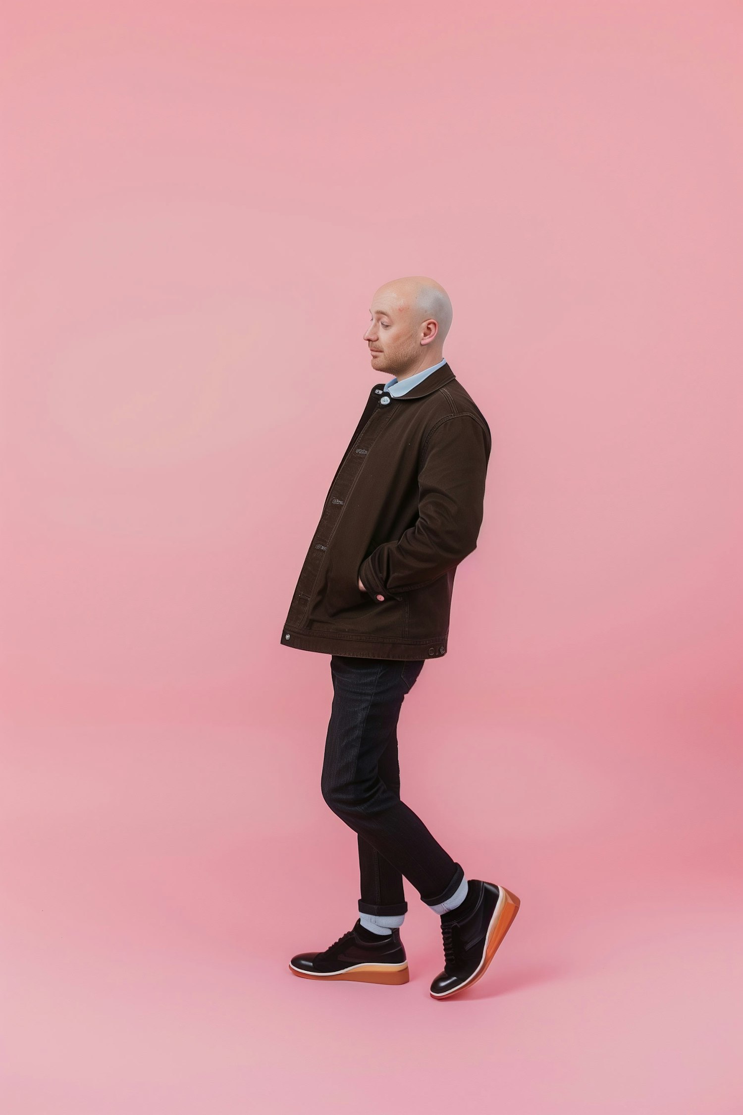 Bald man in brown jacket and jeans stands against a pink background, wearing black sneakers with brown soles. Minimalist fashion style.