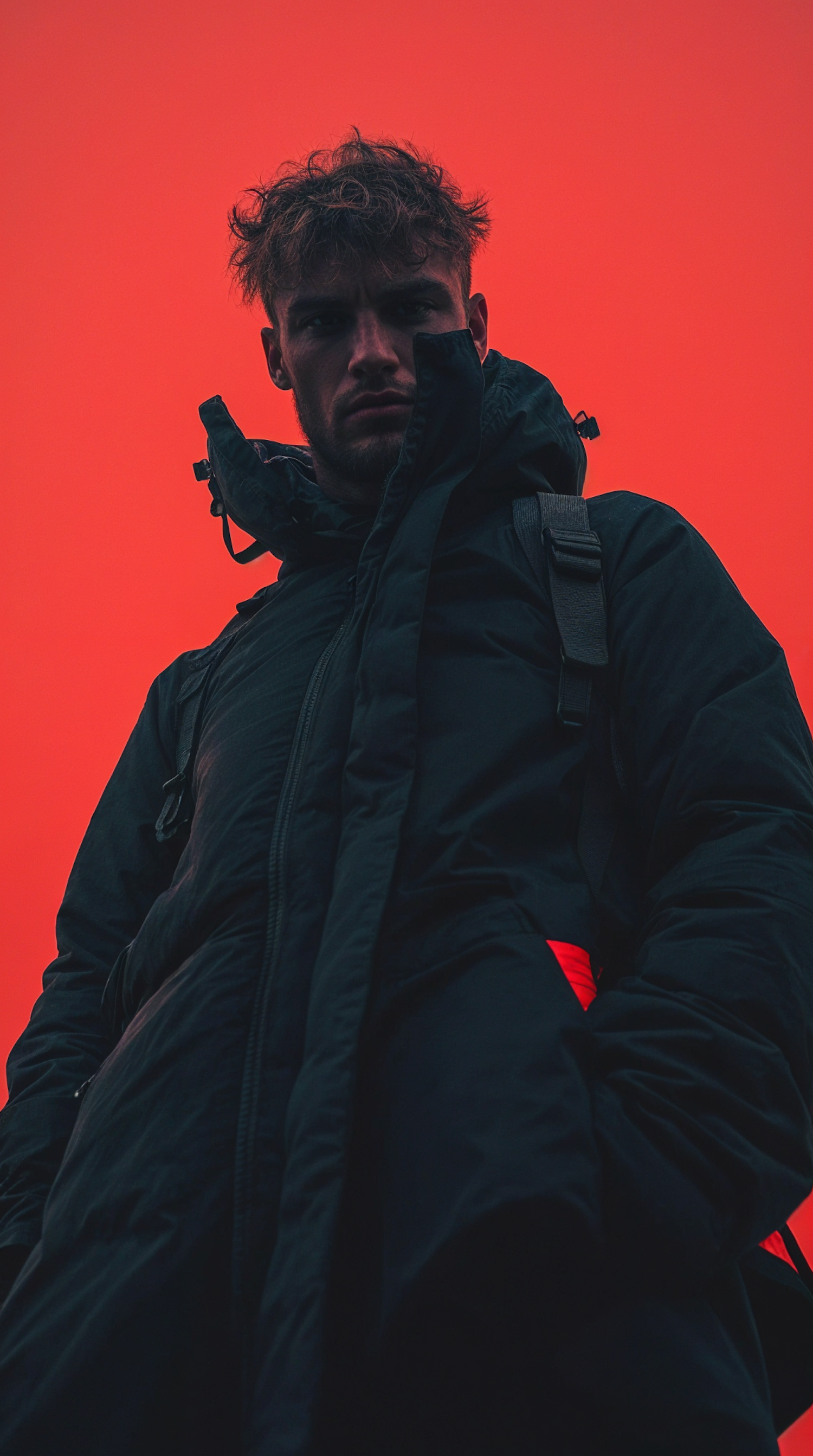 Dramatic portrait of a man in a dark coat against a vivid red sky, emphasizing contrast and intensity.