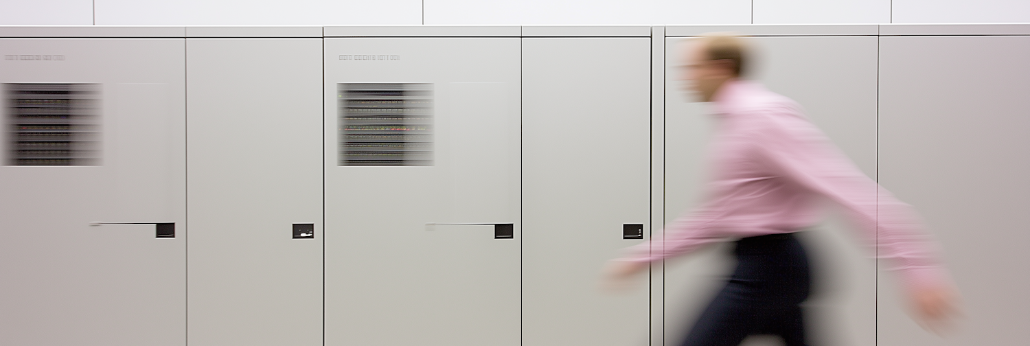 Blurred motion of a man walking past sleek white server cabinets in a modern data center. Clean, minimalistic tech environment.