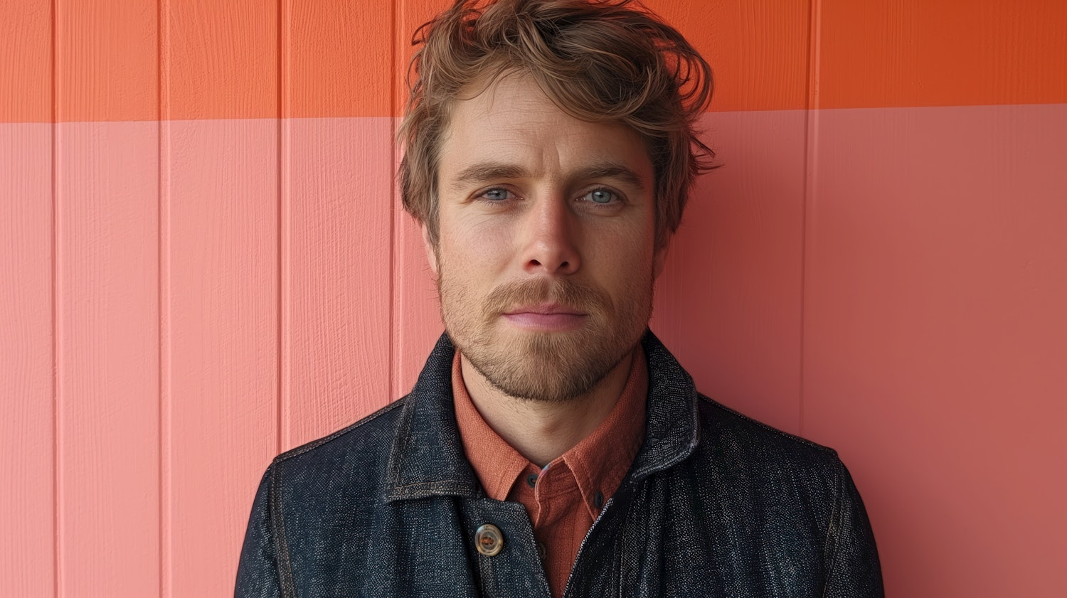 Person in denim jacket and orange shirt stands against a vibrant orange and pink wall, with face intentionally blurred for privacy.