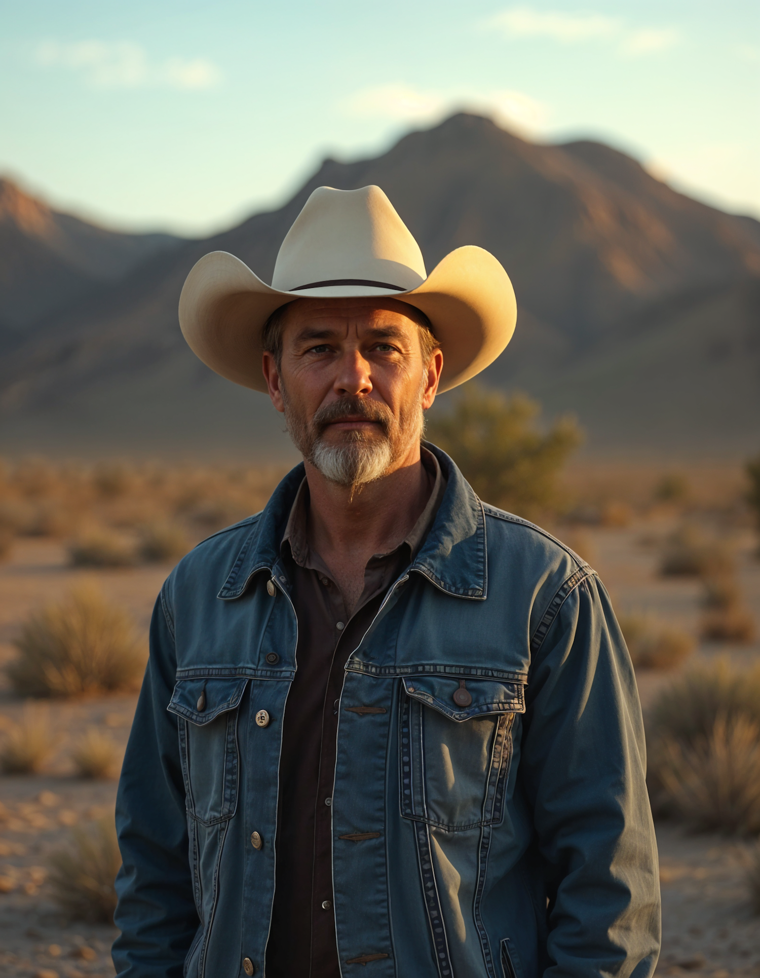 A rugged man in a cowboy hat and denim jacket stands in a desert landscape with mountains in the background during golden hour.