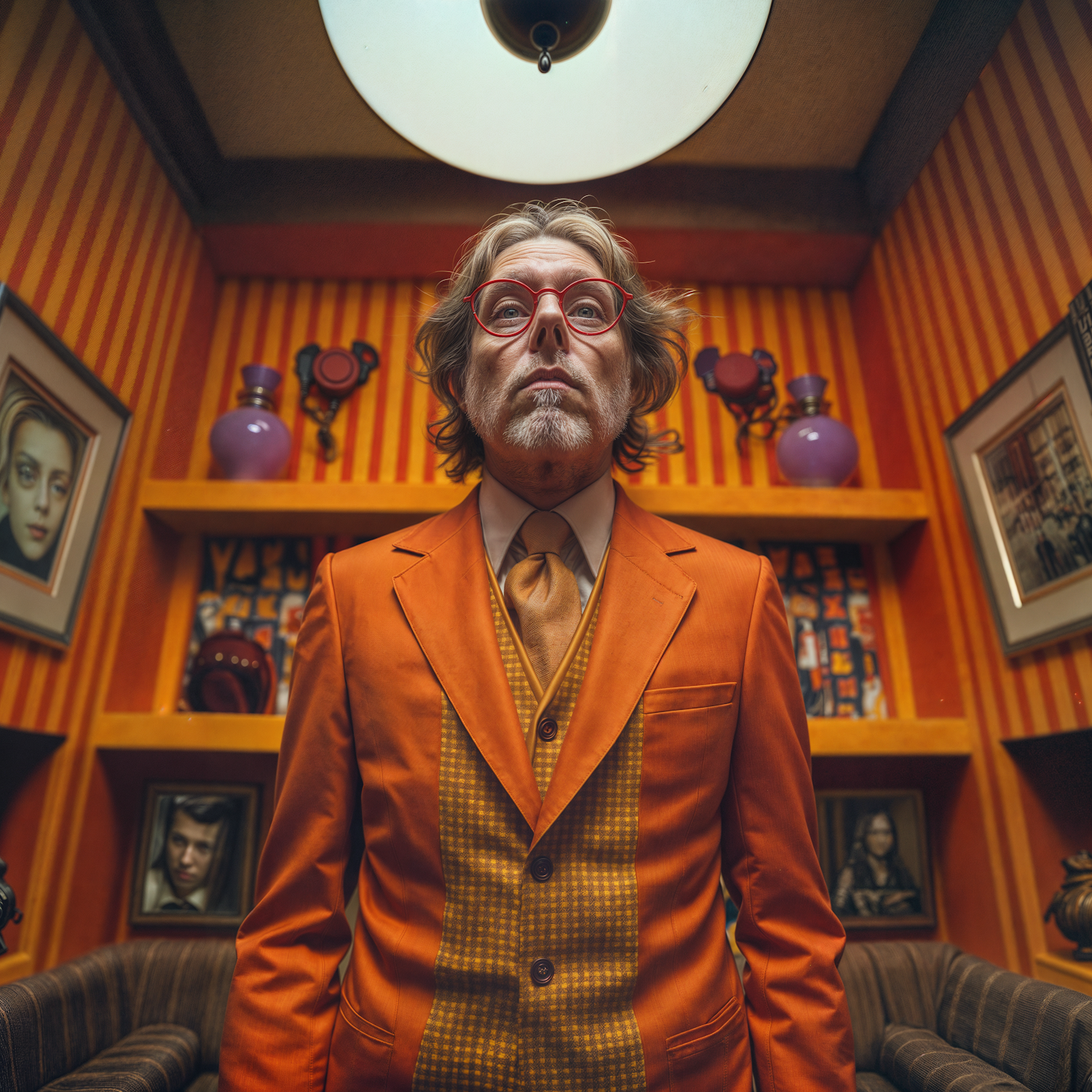 Man in orange suit with red glasses in a vibrant, eclectic room with striped walls and artistic decor.