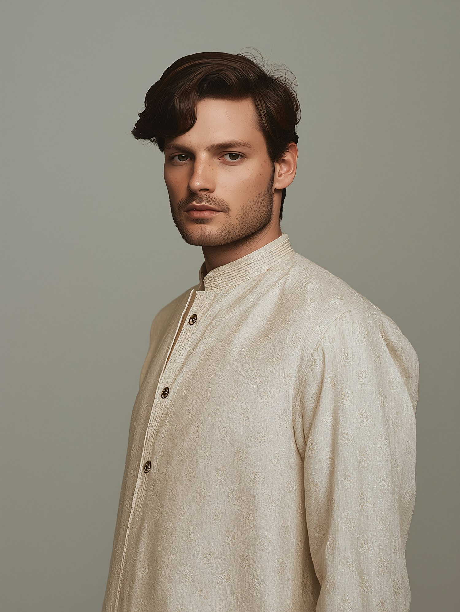 Man in a cream embroidered kurta with a high collar, posing against a neutral gray background, showcasing traditional attire.