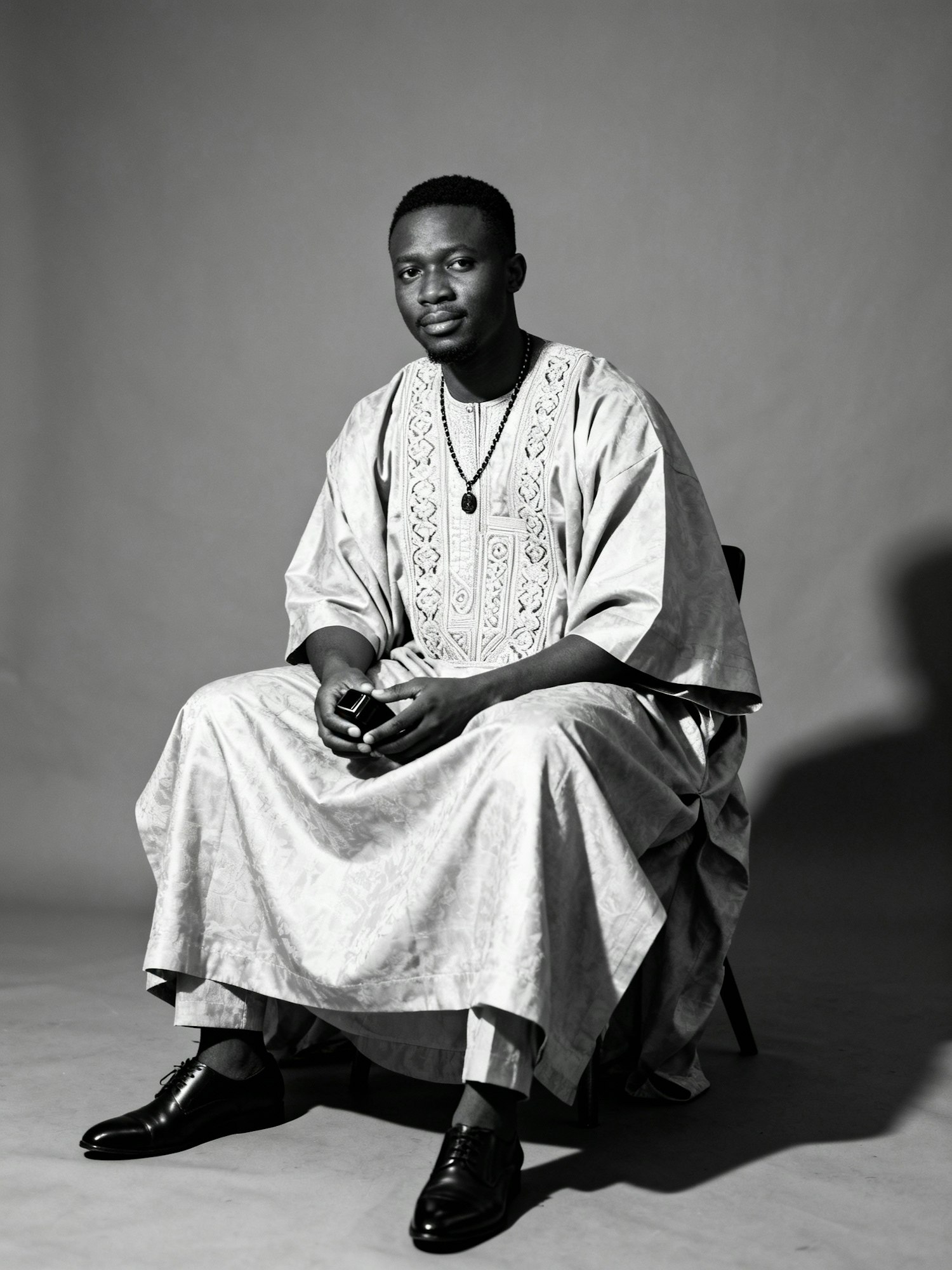 A black-and-white studio portrait of a Black man seated on a stool against a plain backdrop. He wears traditional West African attire—a flowing agbada robe adorned with intricate embroidery that conveys cultural richness and craftsmanship. His posture is relaxed yet composed, with short hair. He holds a small object in his hands, adding a subtle narrative element. Accessories include a necklace and formal shoes, enhancing the blend of tradition and personal style. The lighting is soft and directional, casting gentle shadows that emphasize the folds of the agbada and the contours of his face. The mood is introspective, dignified, and timeless—celebrating cultural identity through fashion and monochrome portraiture.