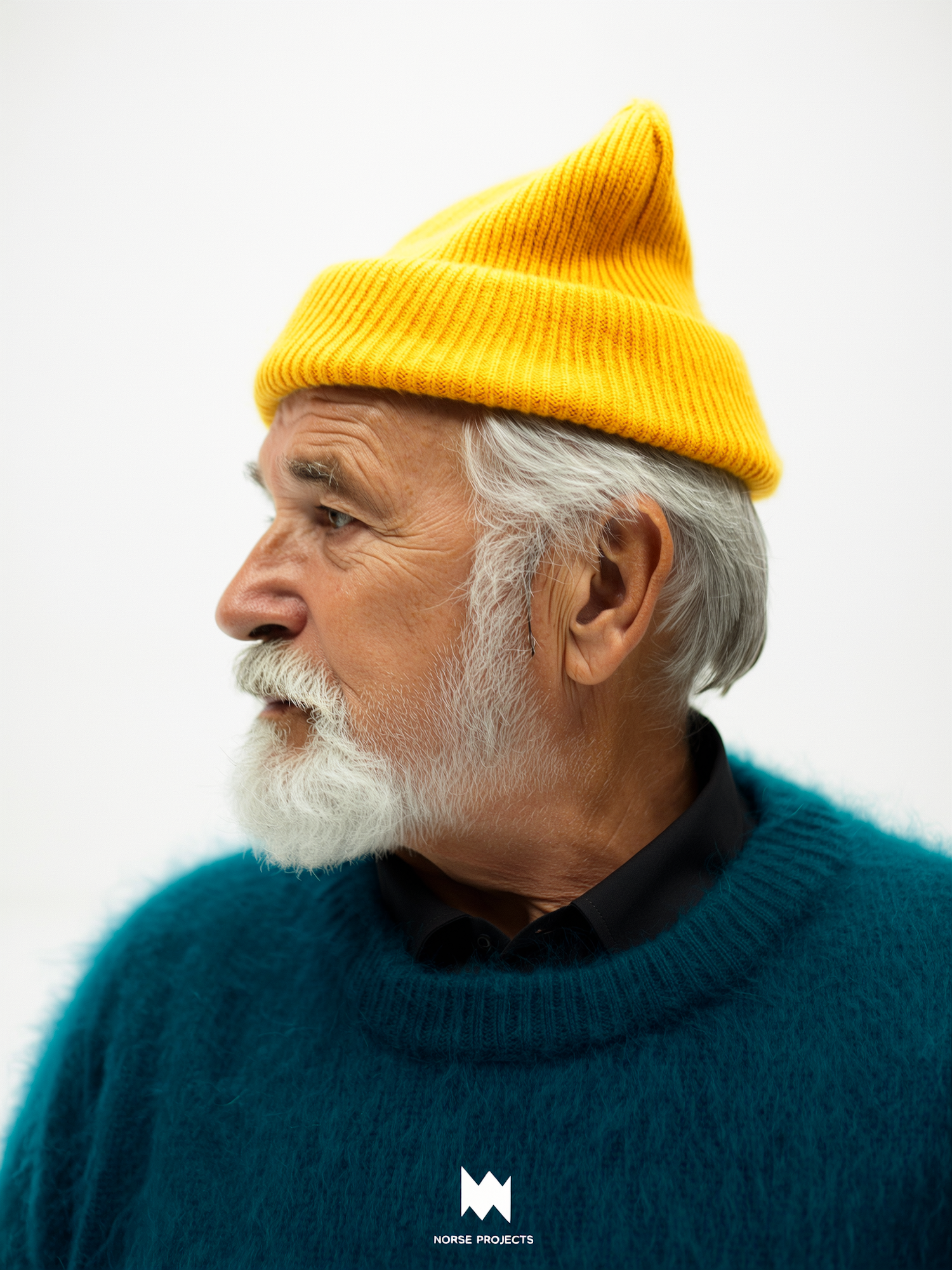 Stylish older man in a yellow beanie and teal sweater, showcasing modern fashion with a clean white background.