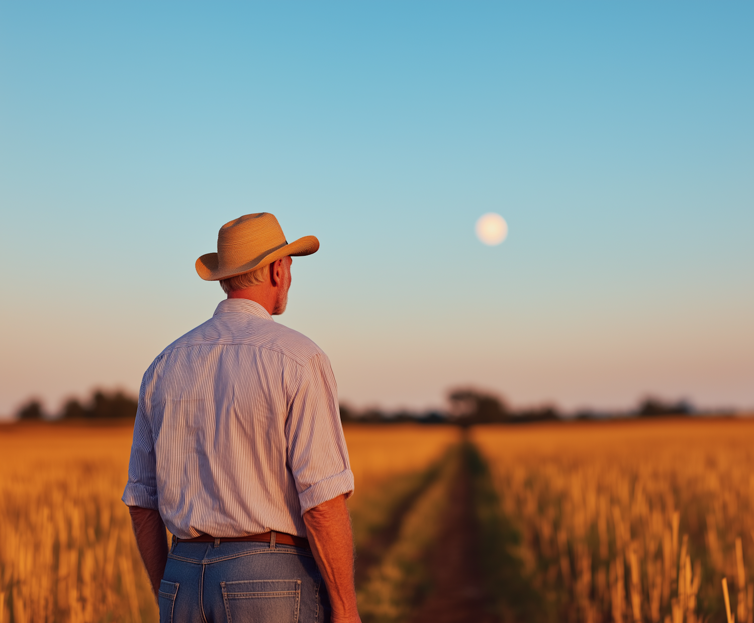 Caucasian man in a wheat field at sunset, wearing a cowboy hat and jeans, gazing at the horizon with a full moon in the sky.