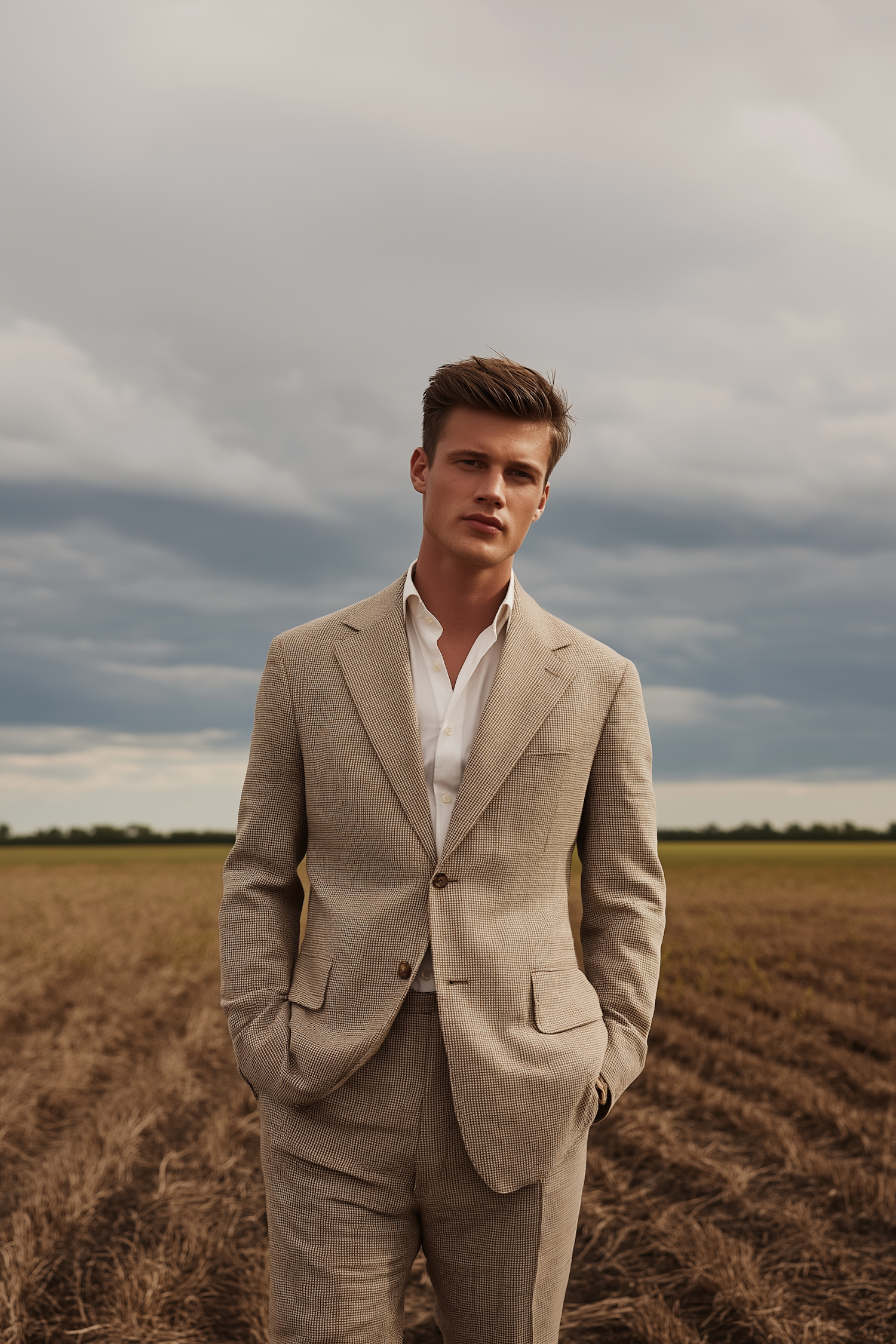 A young man in a beige suit stands in a field under a cloudy sky, exuding a formal yet relaxed vibe.