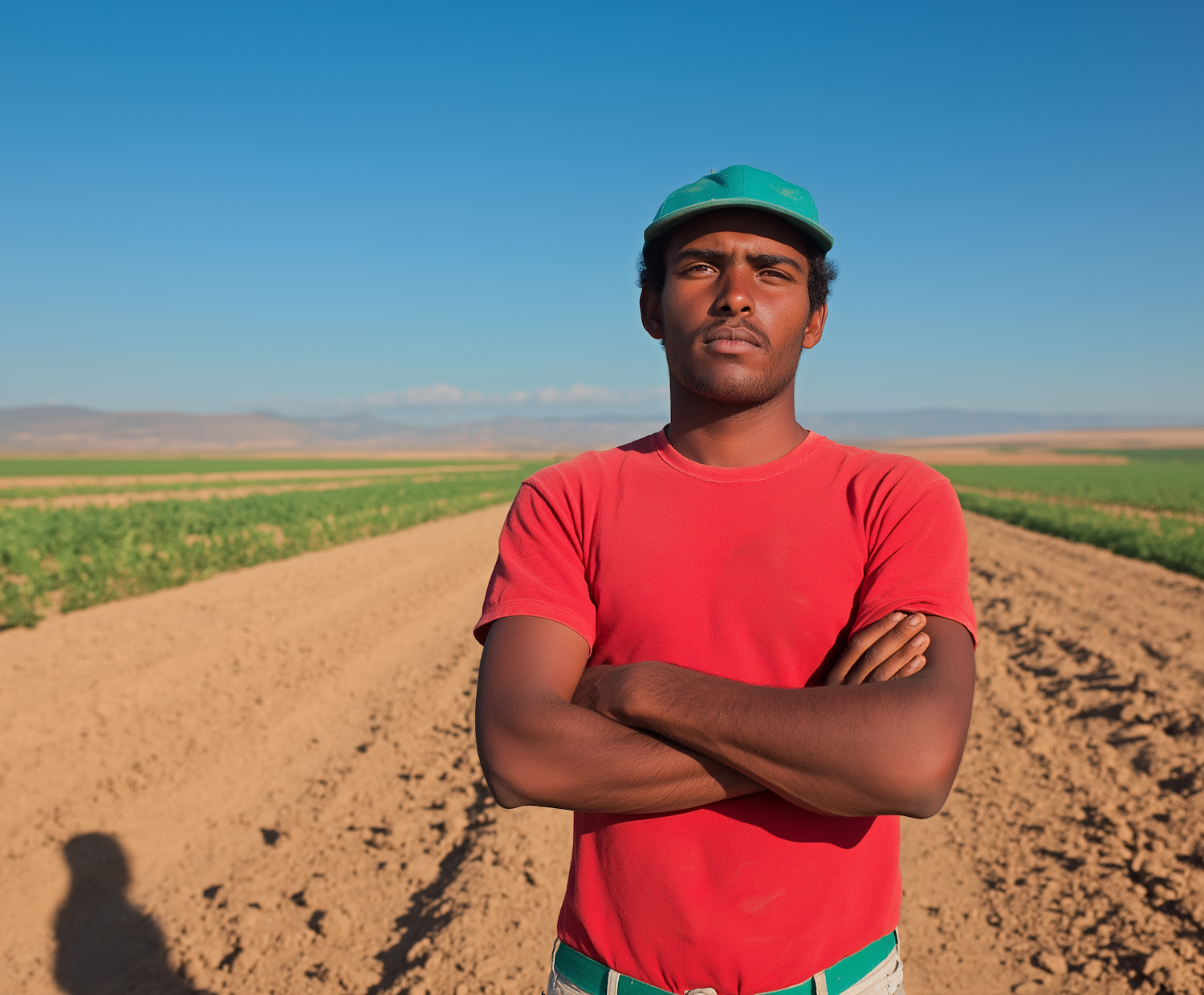 Confident young Black man in a red T-shirt and green cap standing in a plowed field under a clear blue sky.