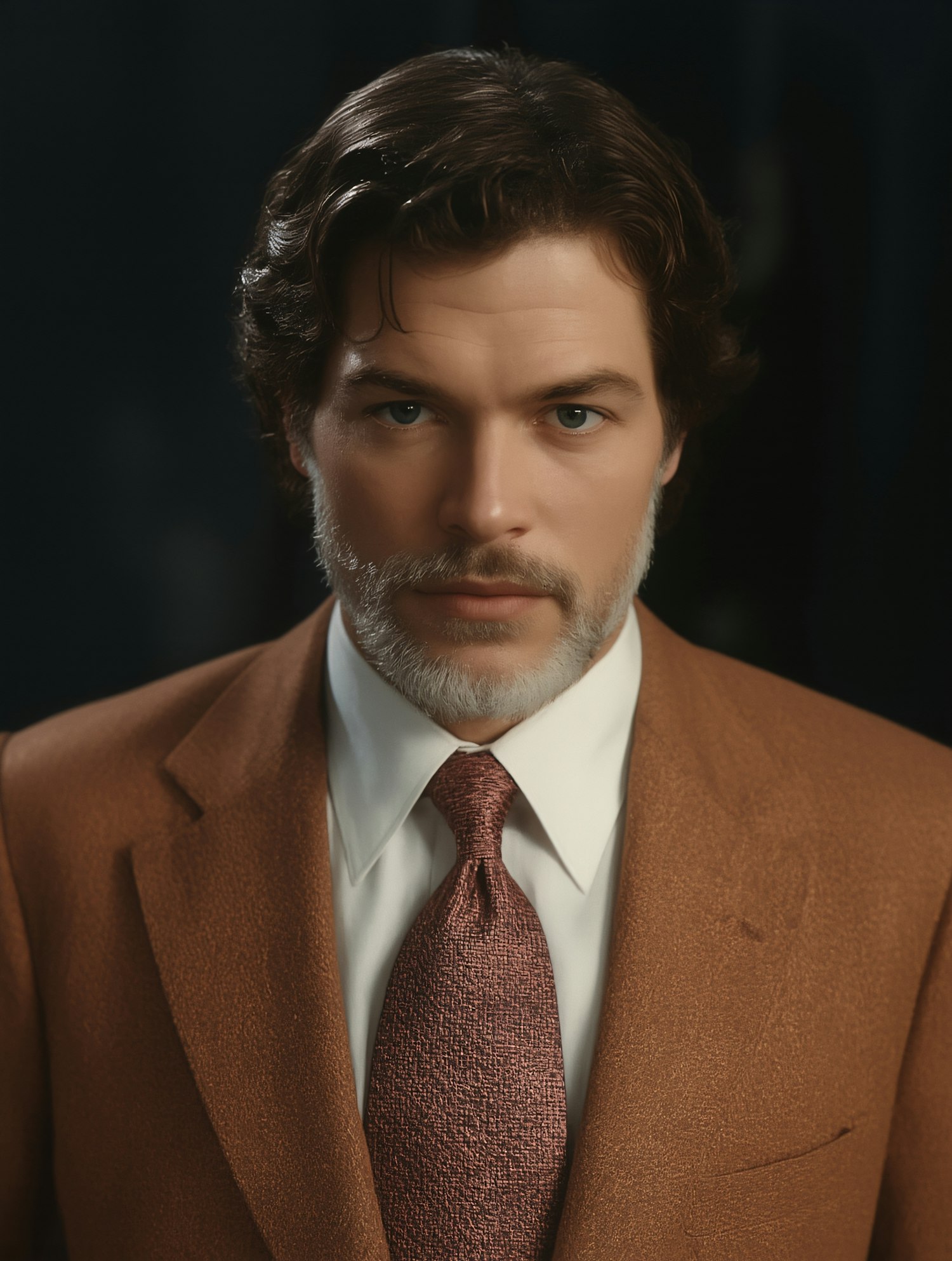 Man in a brown suit and red tie, with a neatly trimmed beard and wavy hair, posing against a dark background.