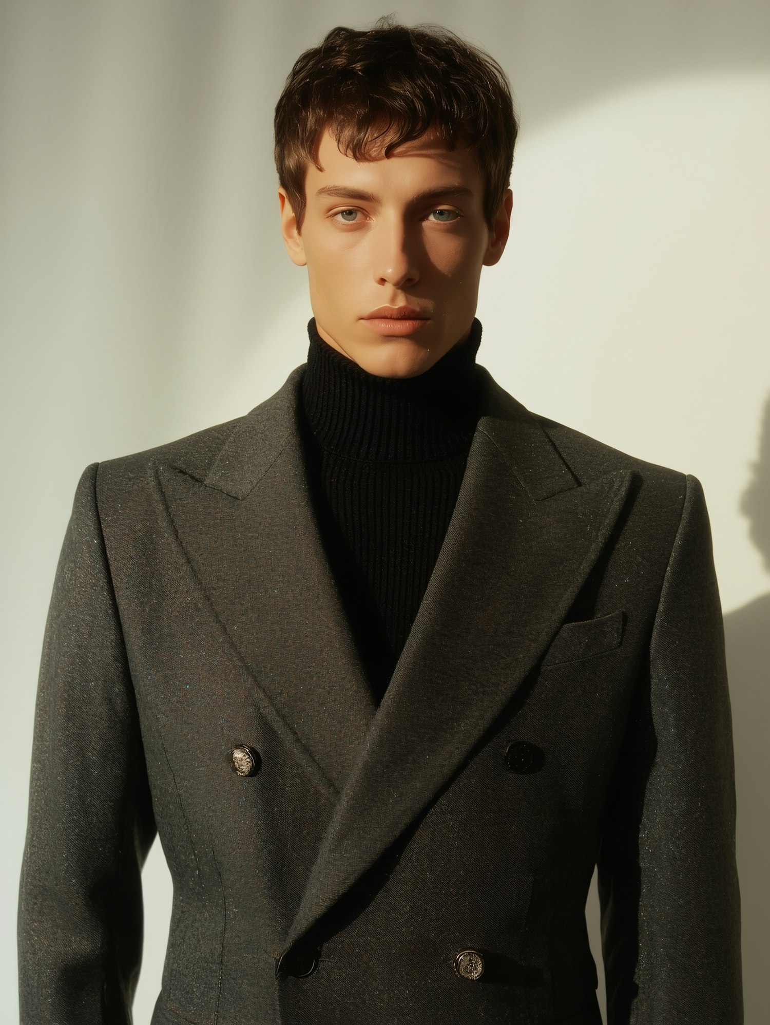 Stylish man in a dark gray double-breasted suit and black turtleneck, posing against a softly lit neutral background.