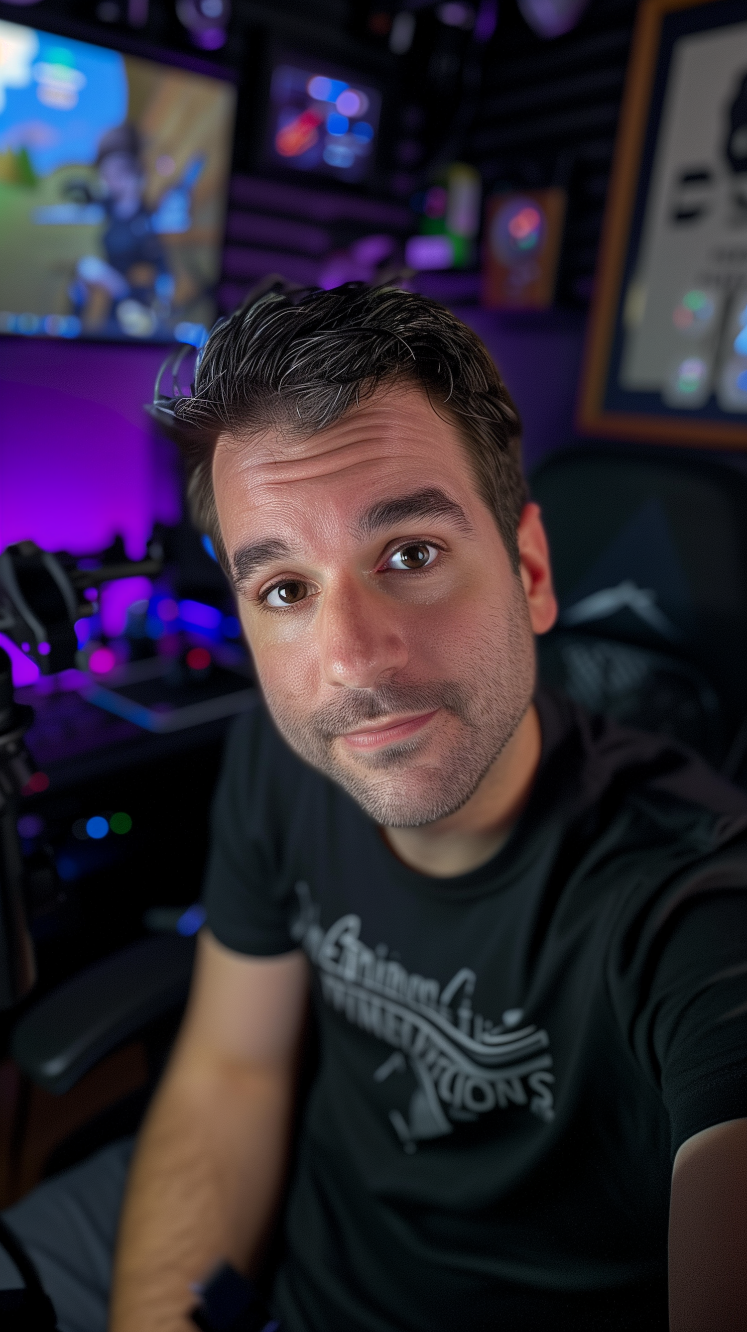 Caucasian man with dark hair and beard in a gaming setup, wearing a black t-shirt. Purple ambient lighting creates a tech-savvy vibe.