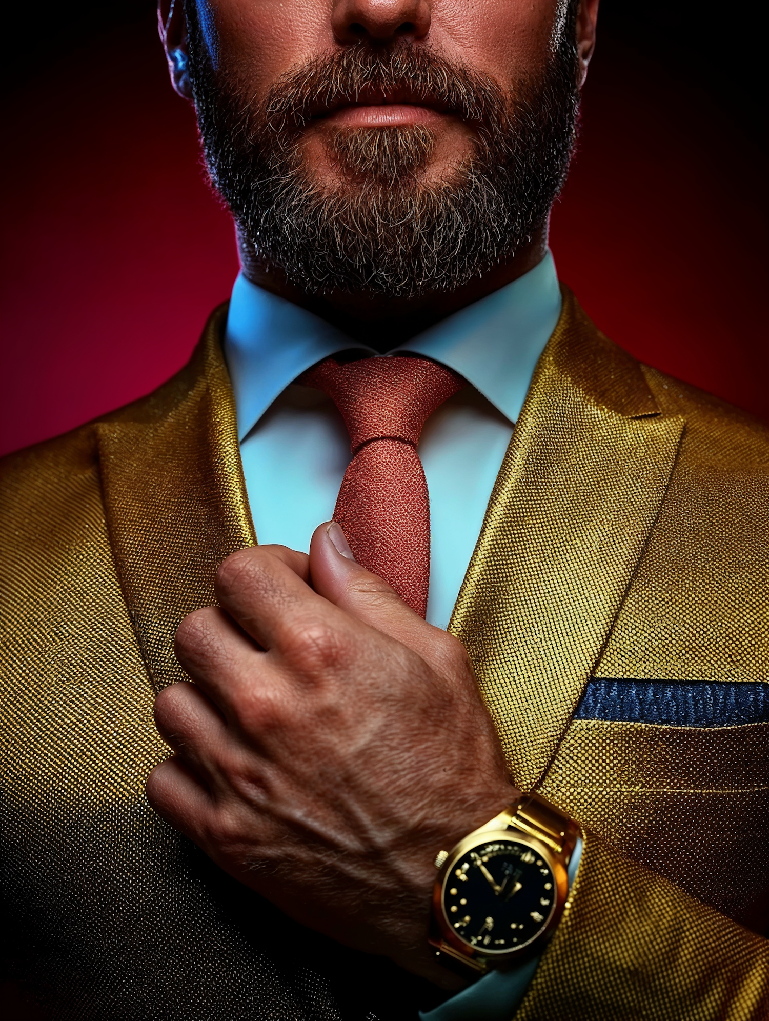 Close-up of a man adjusting his tie, wearing a gold suit, coral tie, and gold watch, set against a dramatic red background.