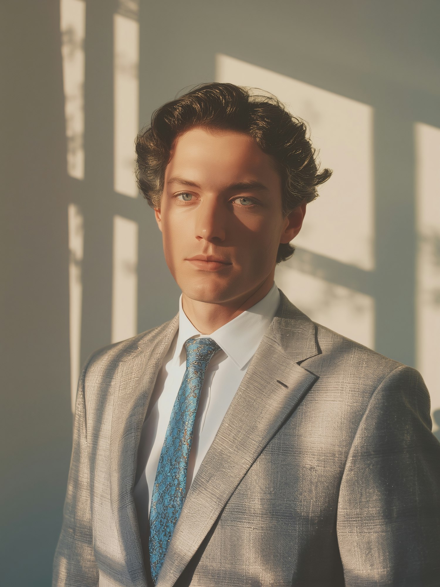 A man in a light gray suit and blue tie stands in soft sunlight, with shadows from a window creating a geometric pattern behind him.