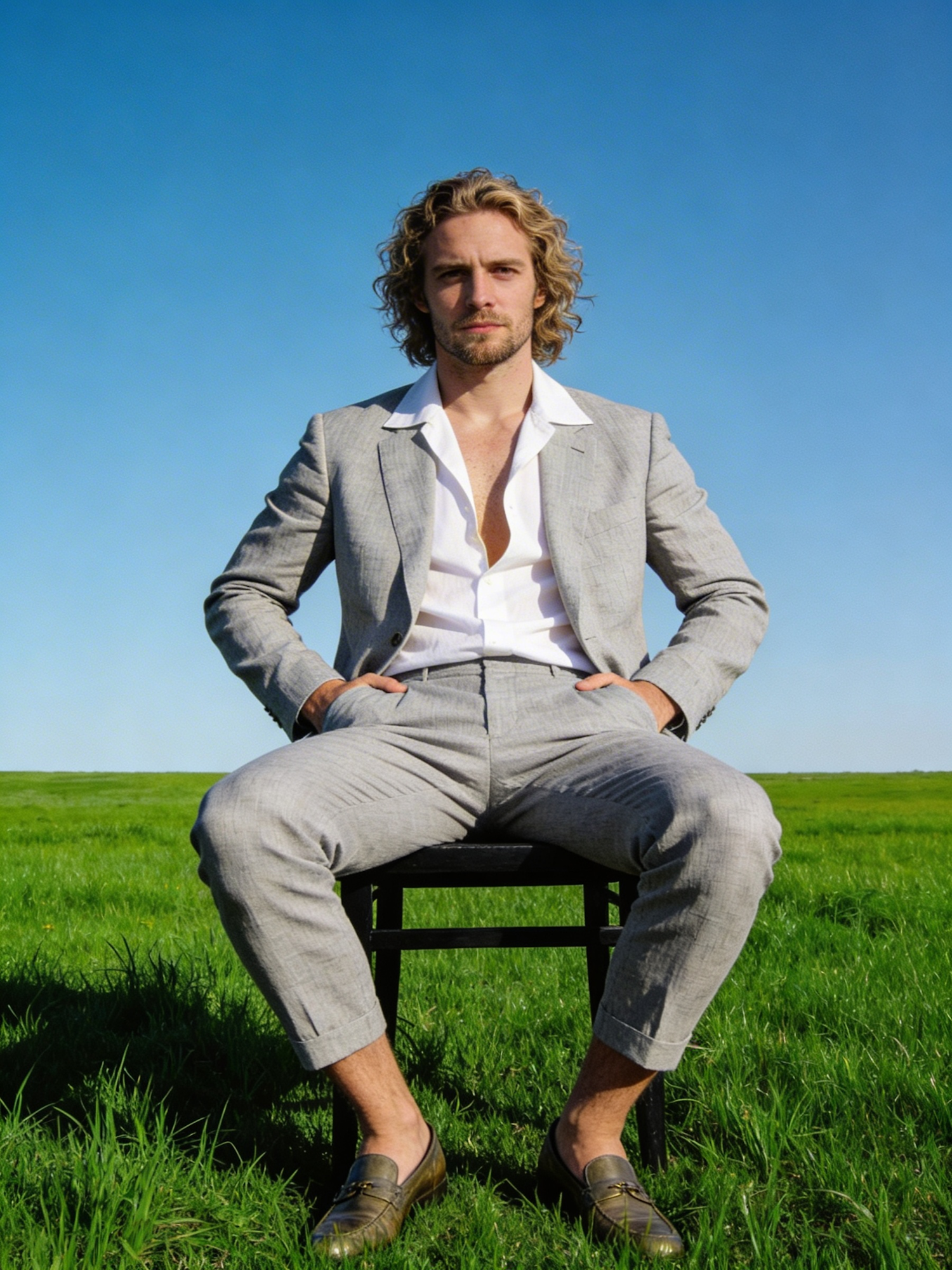 A man in a light gray suit sits in a green field under a blue sky, exuding a relaxed yet stylish vibe.