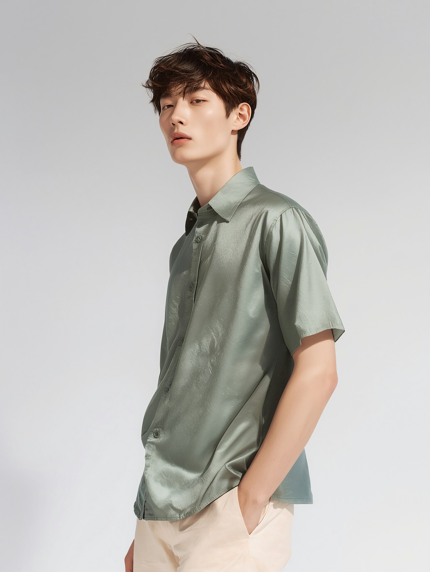 Stylish young man in a light green shirt and beige pants, posing against a minimalistic gray background.