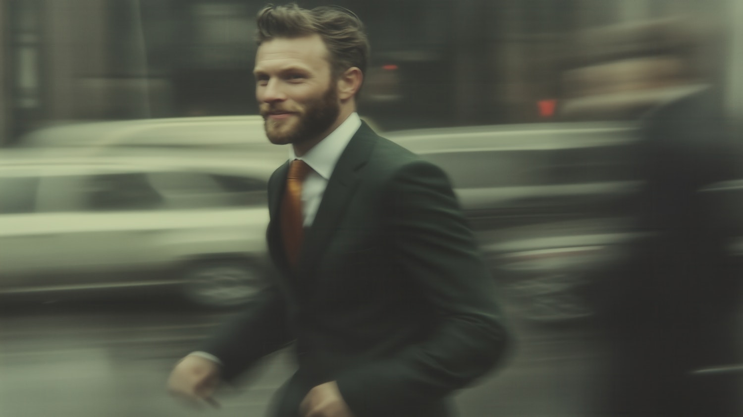 A man in a green suit and orange tie walks briskly through a blurred urban street, exuding confidence and purpose.